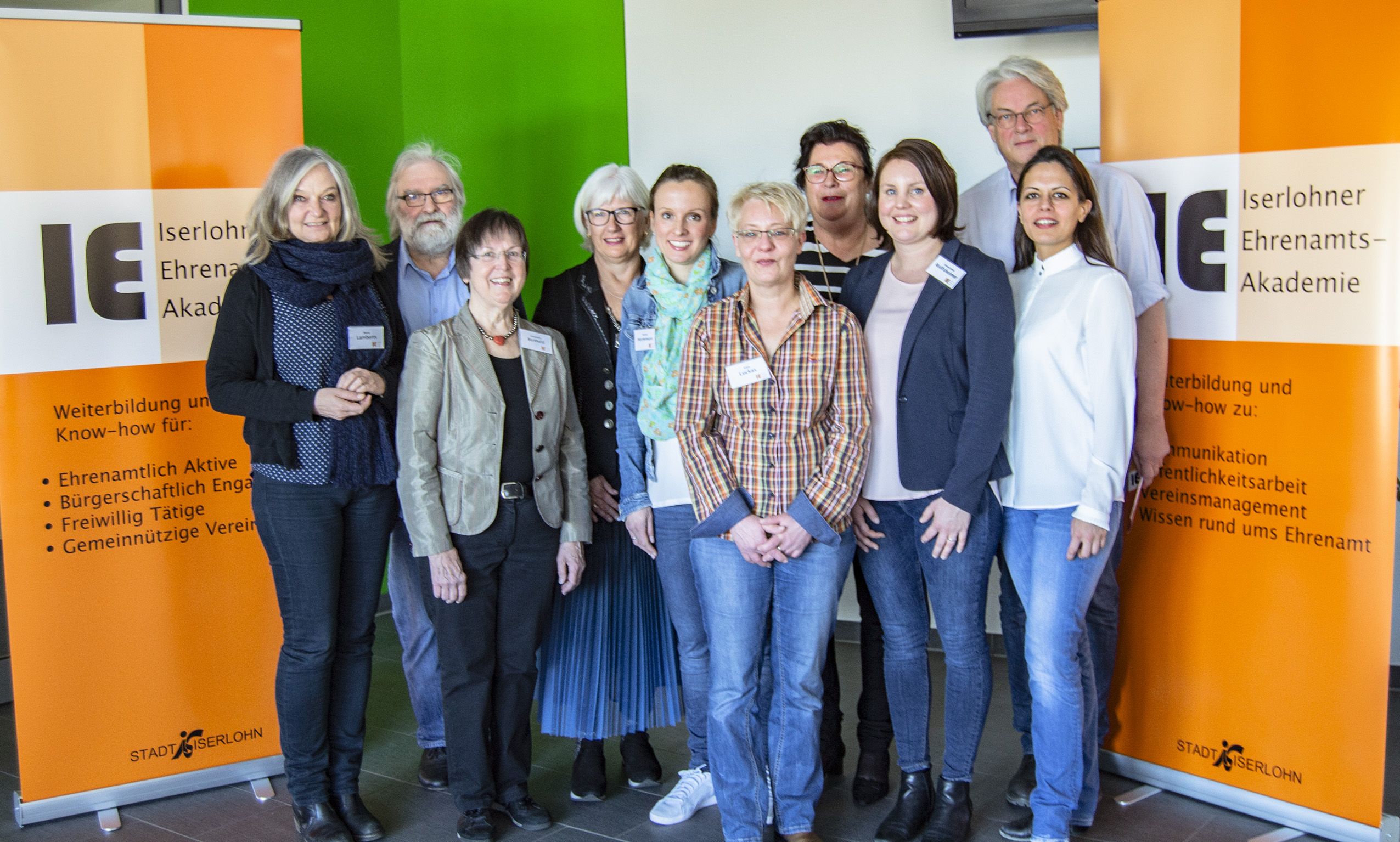 VHS-Leiter Rainer Danne (2. von rechts), Programmbereichsleiterin Ulrike Eichholz (4. von rechts), Projektkoordinatorin Lieselotte Berthold (3. von links) und Dozentinnen und Dozenten erläuterten bei einem Pressetermin am 26. Februar Konzept und Programm der „Ehrenamts-Akademie“.