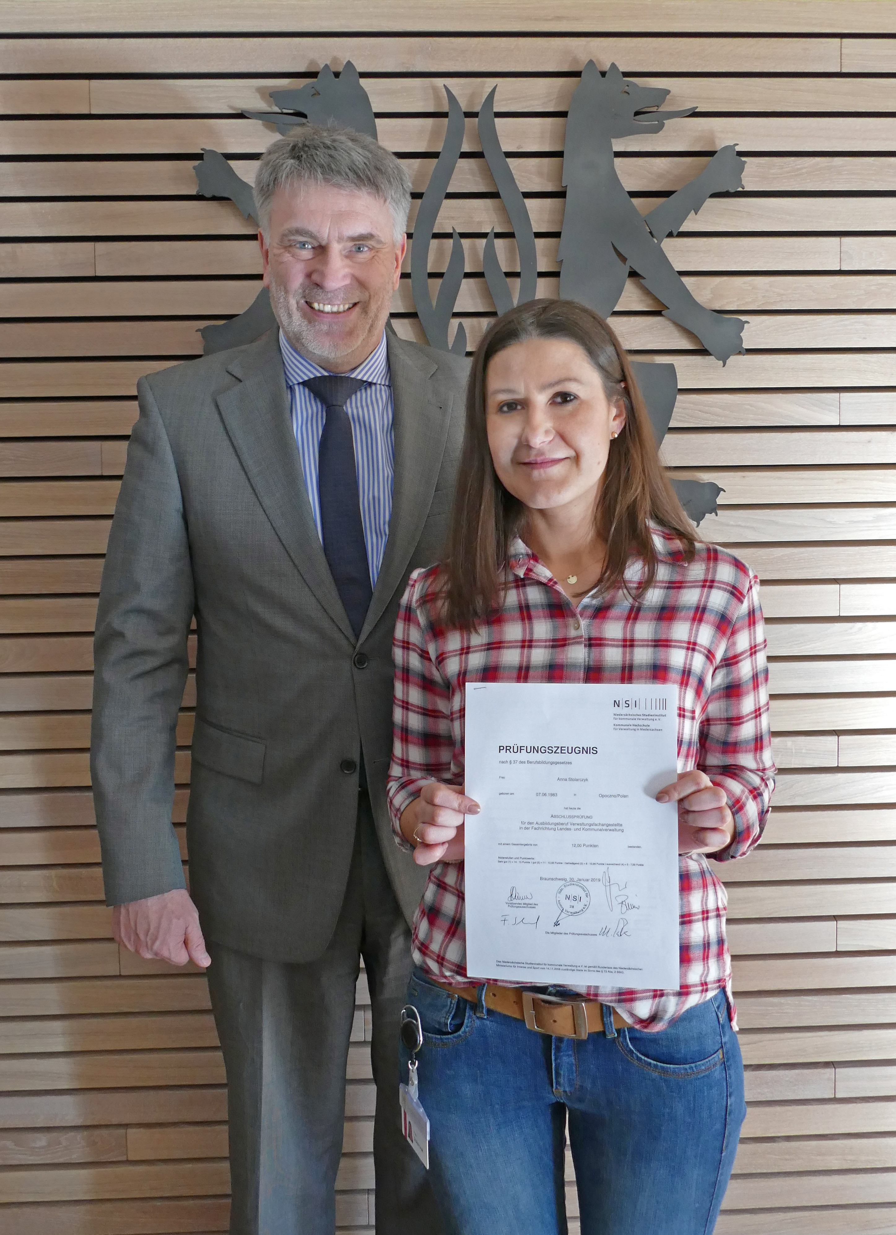 Anna Stolarczyk hat ihre Ausbildung zur Verwaltungsfachangestellten ein halbes Jahr früher abgeschlossen. Erster Kreisrat Henning Heiß beglückwünschte die 35-Jährige zu dieser guten Leistung. Foto: Landkreis Peine
