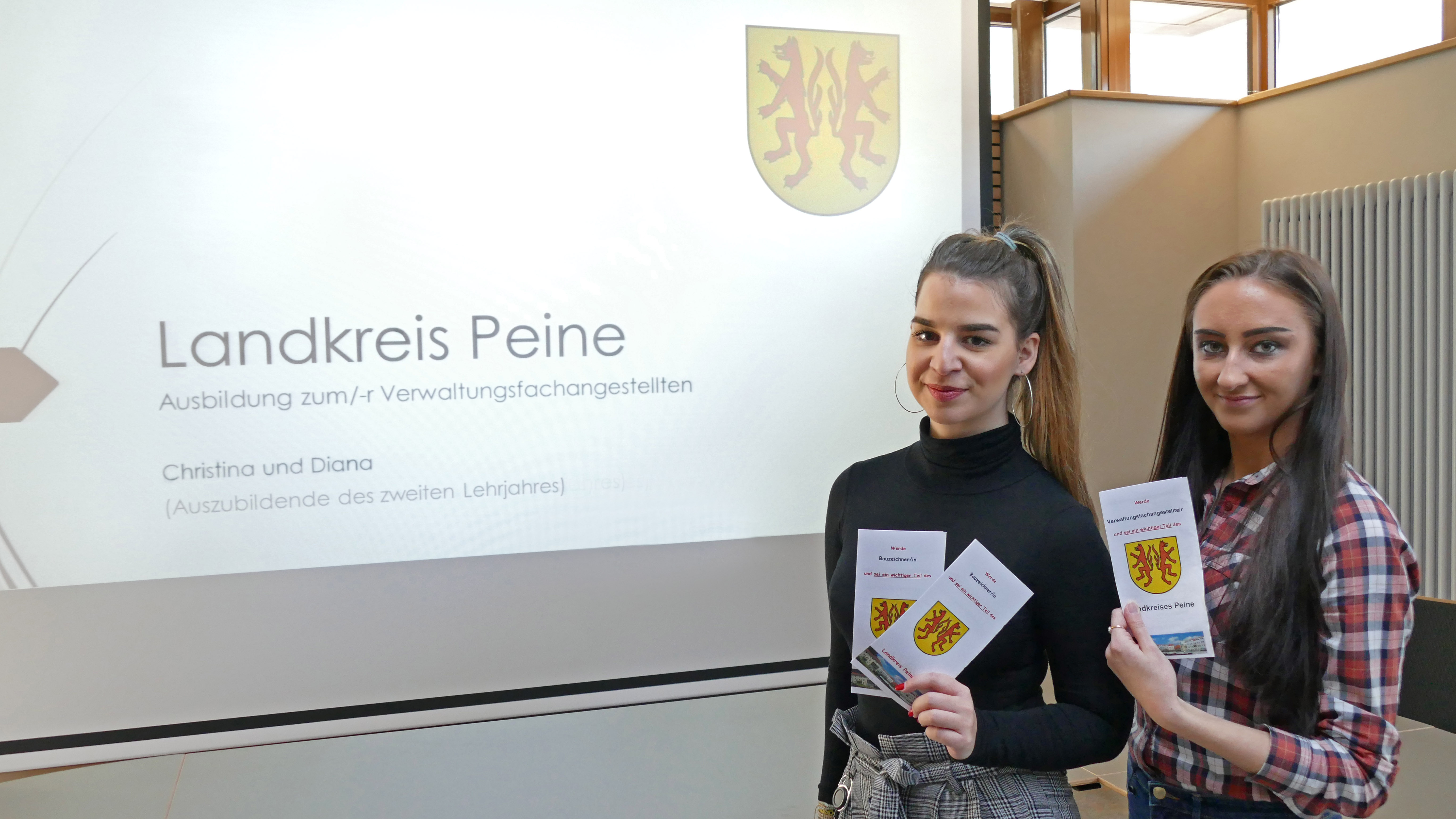 Christina Pappas (links) und Diana Eifert stellten den Achtklässlern der Bodenstedt-Wilhelmschule die Ausbildungsmöglichkeiten beim Landkreis Peine vor. Foto: Landkreis Peine