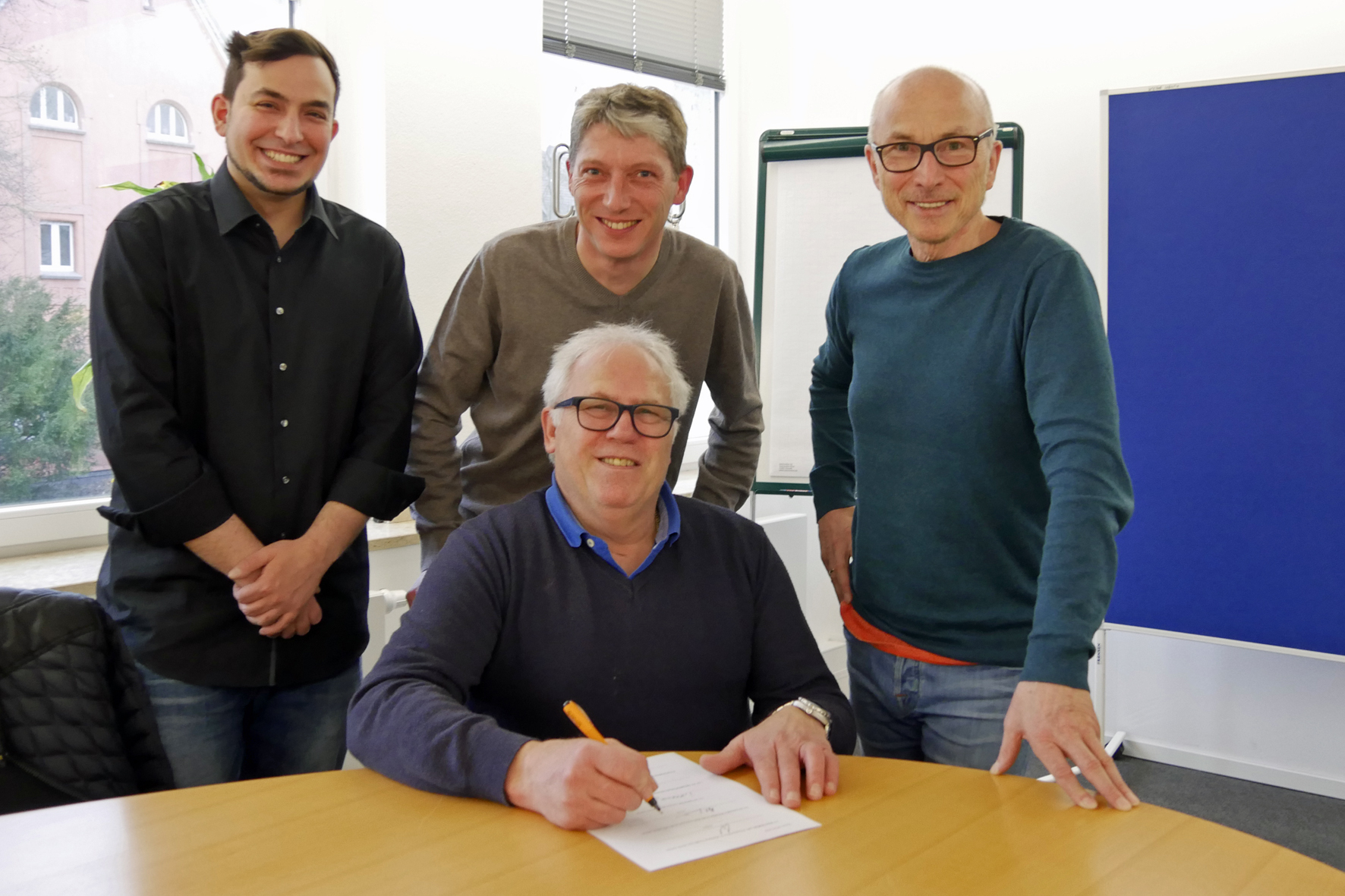 Die Gastronomen Tassilo Heine, Frank Südfeld (von links nach rechts) und Klaus Gerner (sitzt) unterschreiben die freiwillige Selbstverpflichtung keine Feuerwerke in Elpe und Ried zu zünden. Sie hatten sich auf den Vorschlag von Bürgermeister Fred Toplak zusammengetan.