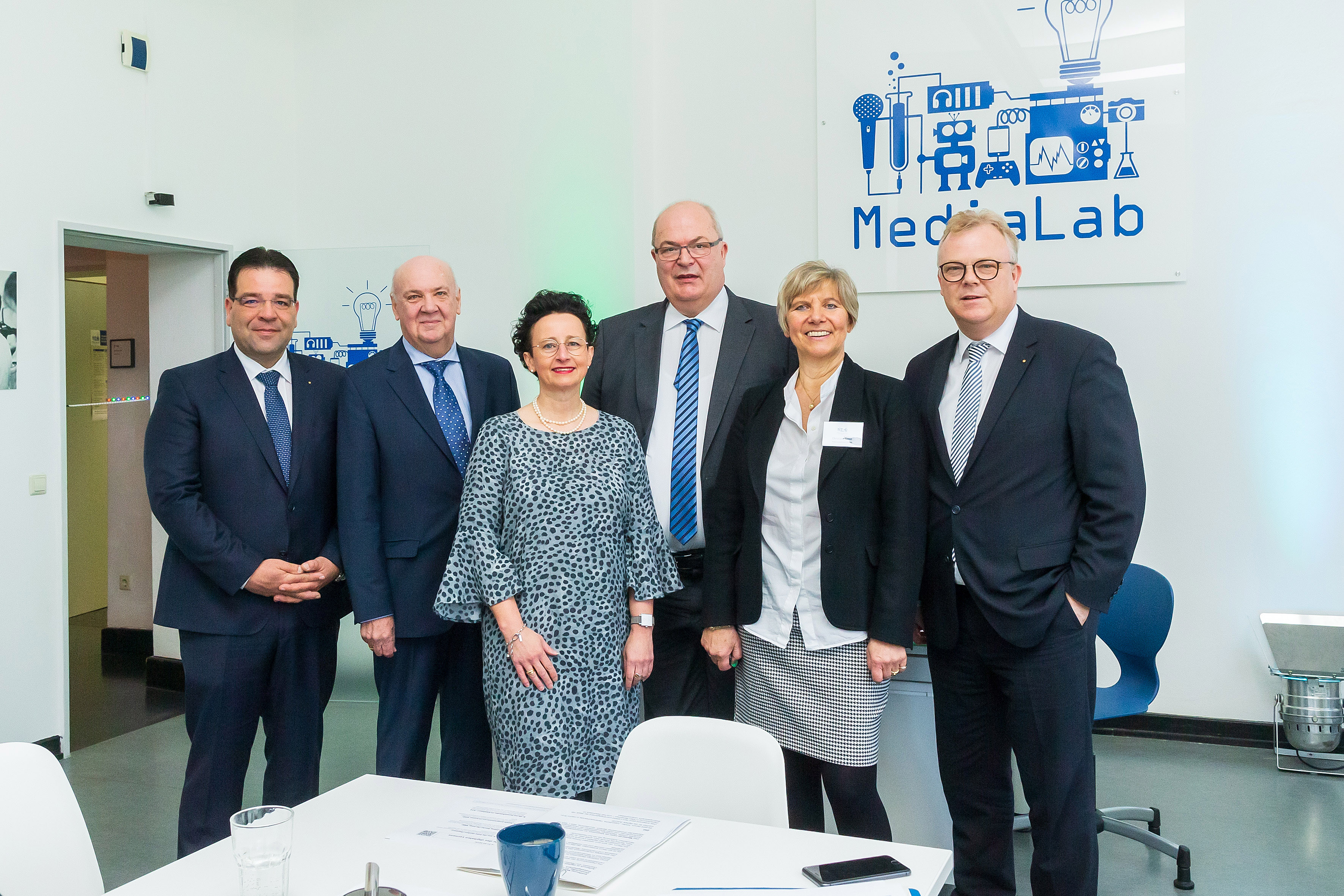 von links: Burkhard Reher (Volksbank Hamm Stiftung), Manfred Lindemann (Vorsitzender Schulausschuss), Bildungsdezernentin Dr. Britta Obszerninks, OB Thomas Hunsteger-Petermann, Christiane Simon (Leiterin Medienzentrum), Markus Dünnebacke (Volksbank Hamm Stiftung)