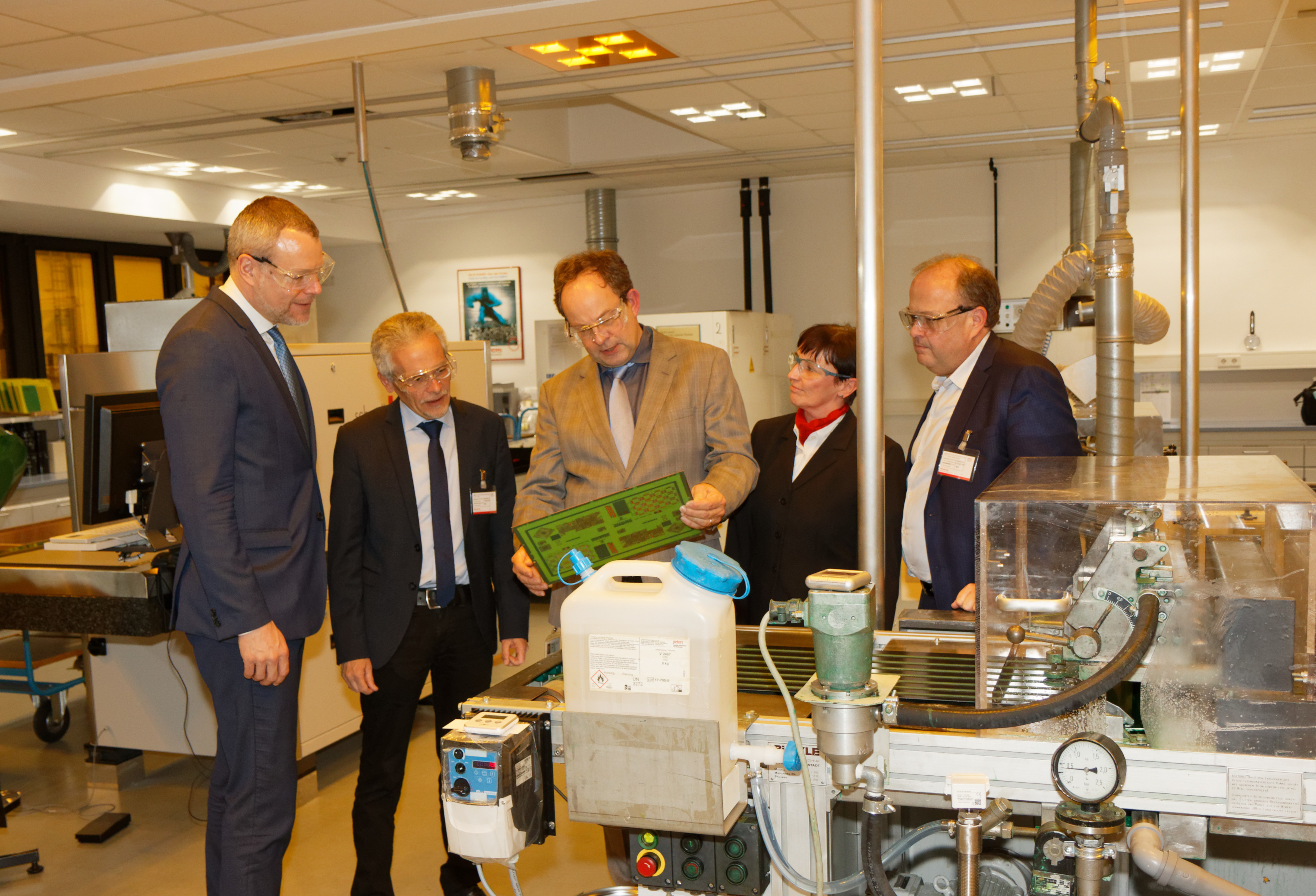 Hightech-Leiterplatten mit Beschichtungen der Peters-Gruppe aus Kempen: (v.l.) Landrat Dr. Andreas Coenen, Bürgermeister Volker Rübo, Geschäftsführer Ralf und Brigitte Schwartz, WFG-Geschäftsführer Dr. Thomas Jablonski. Foto: Kreis Viersen / Abdruck honorarfrei