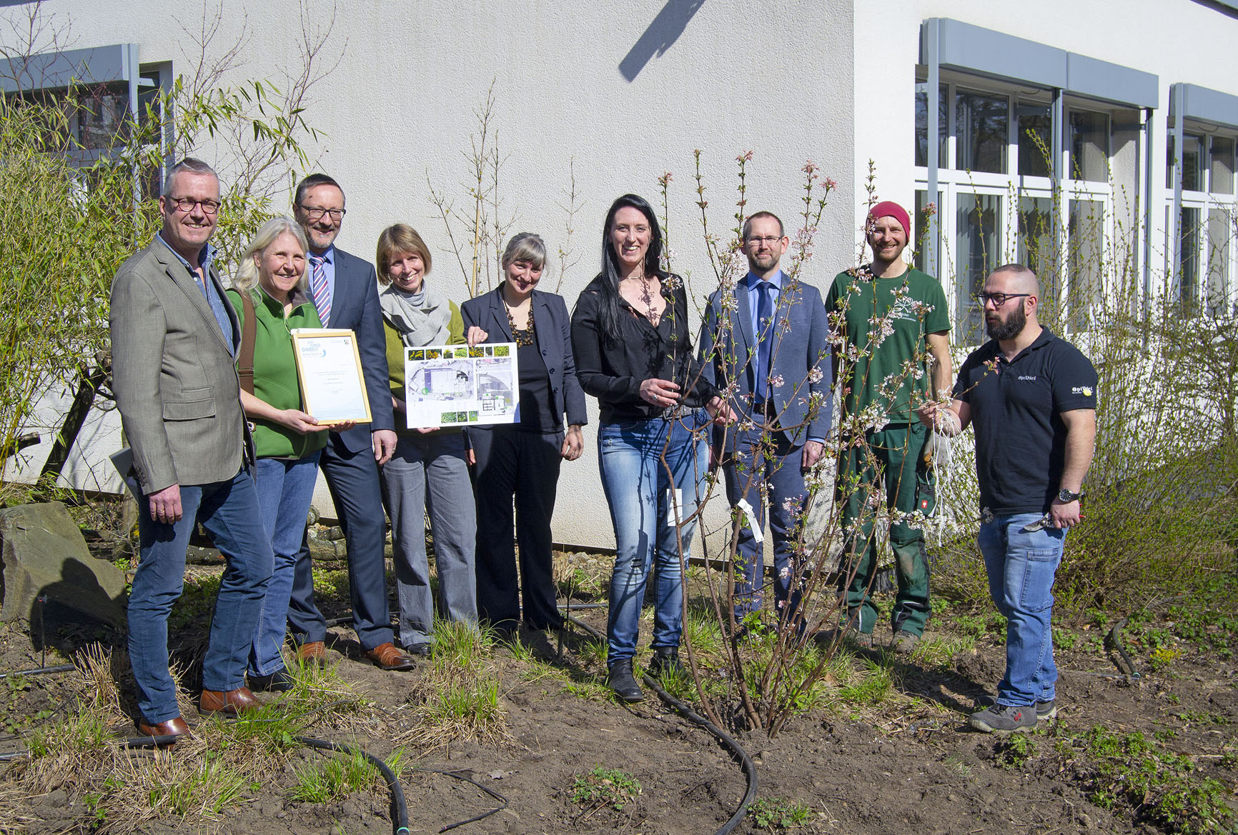 Projektpartner der „Blühenden Visitenkarten“ trafen sich zur ersten Pflanzaktion bei der Firma Optimel (v.l.): Dr. Jens Ferber (SIHK), Patricia White (Stadt Iserlohn), Thomas Haude (GfW), Dr. Anke Valentin (Wissenschaftsladen Bonn), Meike Rohk-emper (Global Nature Fund), Eva Ranft (Firma Optimel), Stadtbaurat Thorsten Grote sowie Hens Böcker (GaLaBau) und Giuseppe Dituri (Firma Optimel).