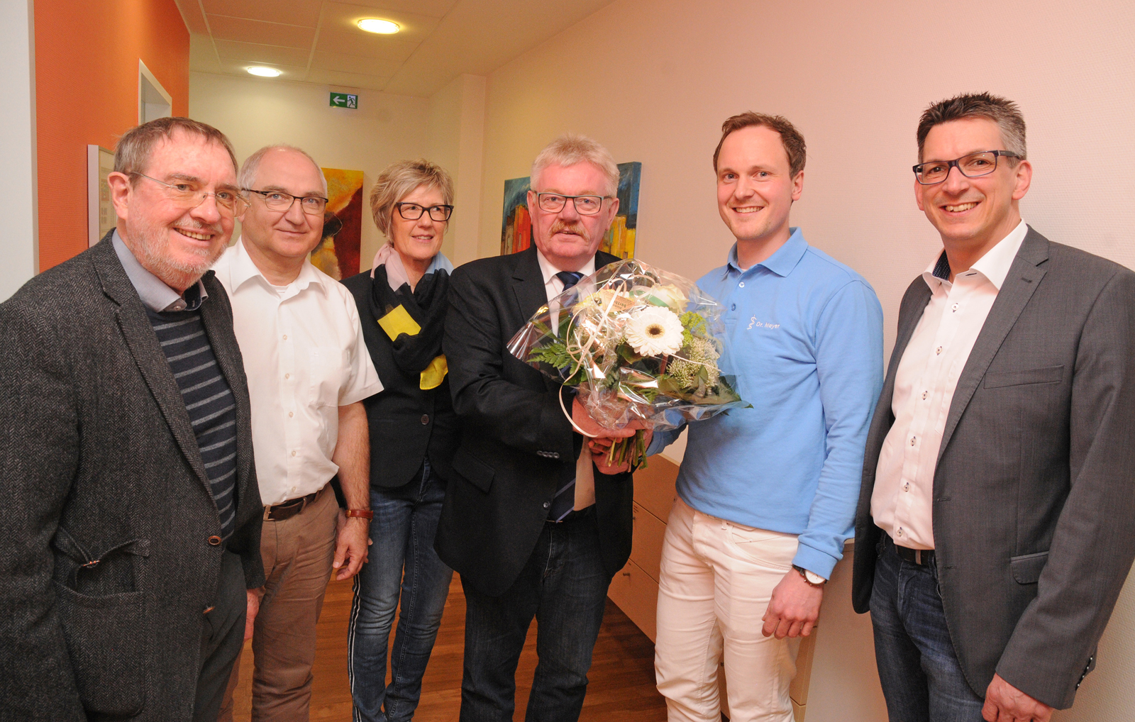Dr. Enno Meyer (2.v.r.) ist seit dem 1. April 2019 neuer niedergelassener Hausartz in der Gemeinschaftspraxis von Dr. Klaus Oehmen (2.v.l.) / Dr. Enno Meyer - Bürgermeister Peter Nebelo (Mitte), Sascha Terörde (re), Elisabeth Böing (3.v.r.) und Dr. Michael Adam besuchten ihn in der Praxis - Foto: Bruno Wansing, Stadt Bocholt