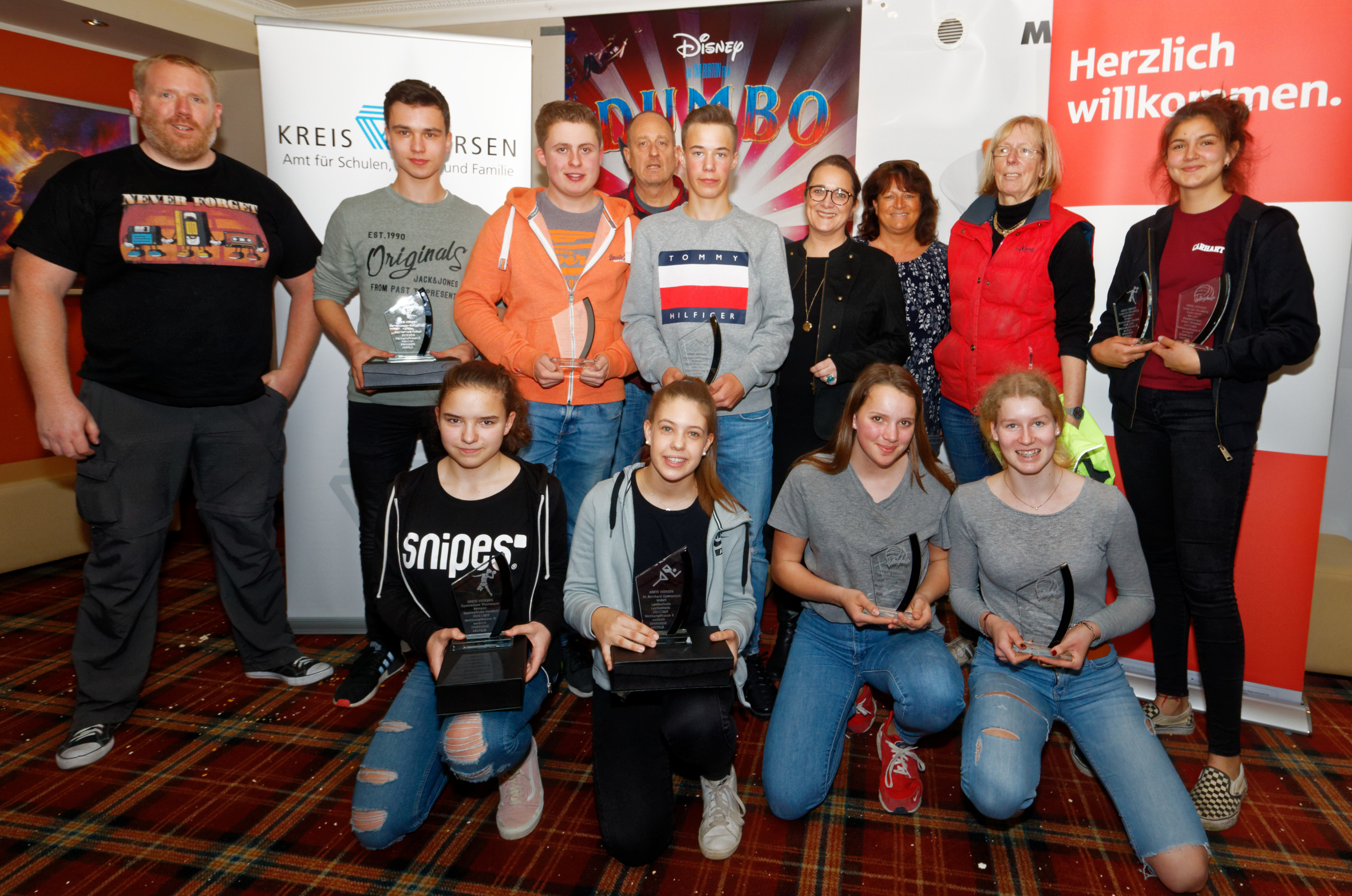 Die erfolgreichen Sportler der Schulen im Kreis Viersen. Ingo Heisters (l.), Geschäftsführer des Ausschusses für den Schulsport im Kreis Viersen, Joachim Hennig (Mitte), Abteilungsleiter des Schulamtes für den Kreis Viersen, Michaela Rausch (4.v.l.), Referentin Sponsoring der Sparkasse Krefeld, und Angelika Feller (2.v.r.) ehren die Kreismeister im Rahmen eines Kinonachmittags in Kempen. Foto: Kreis Viersen / Abdruck honorarfrei