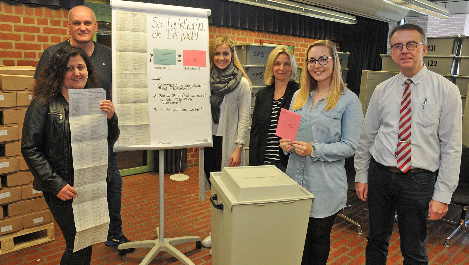 Das Team vom Wahlamt hat jetzt den Raum Rossendale im Rathaus, Berliner Platz 1, für die Europawahl am 26.5.2019 bezogen, v.l.n.r.: Gülhan Zorlu, Norbert Olbing, Louisa Müggenborg, Michaela Brands, Leonie Waters und Martin Wolters - Foto: Bruno Wansing, Stadt Bocholt