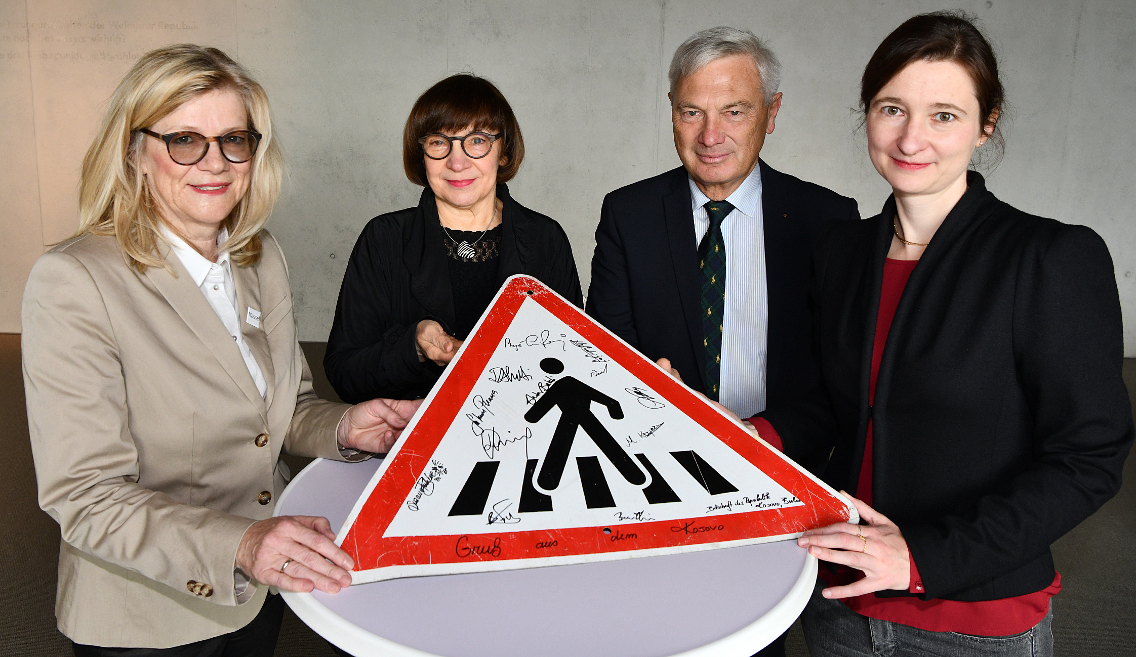 Von Botschaftsangehörigen signiert: Ein Fußgängerschild aus dem Kosovo für die „Internationale Sammlung originaler Verkehrszeichen für Fußgängerüberwege“ halten Kulturamtleiterin Carola Metz, Sammlerin Doris Gutermuth, Bundeswehr-Oberst a.D. Hans Werner Patzki und Kulturdezernentin Susanne Völker in den Händen