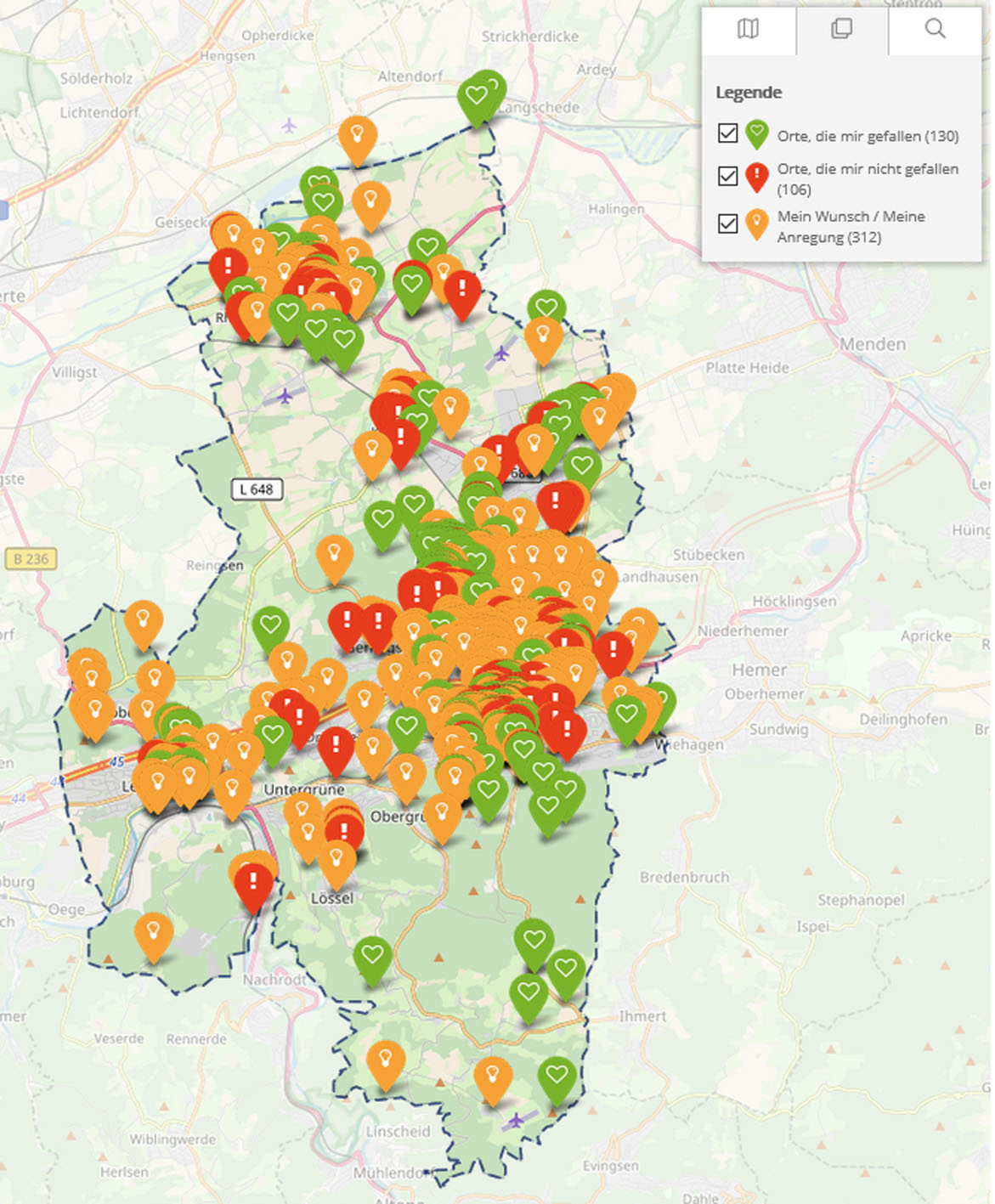 Im Rahmen der Online-Beteiligung konnten alle interessierten Bürgerinnen und Bürger in einer digitalen Karte Orte markieren, die ihnen gut oder schlecht gefallen oder für die es Anregungen gibt.
