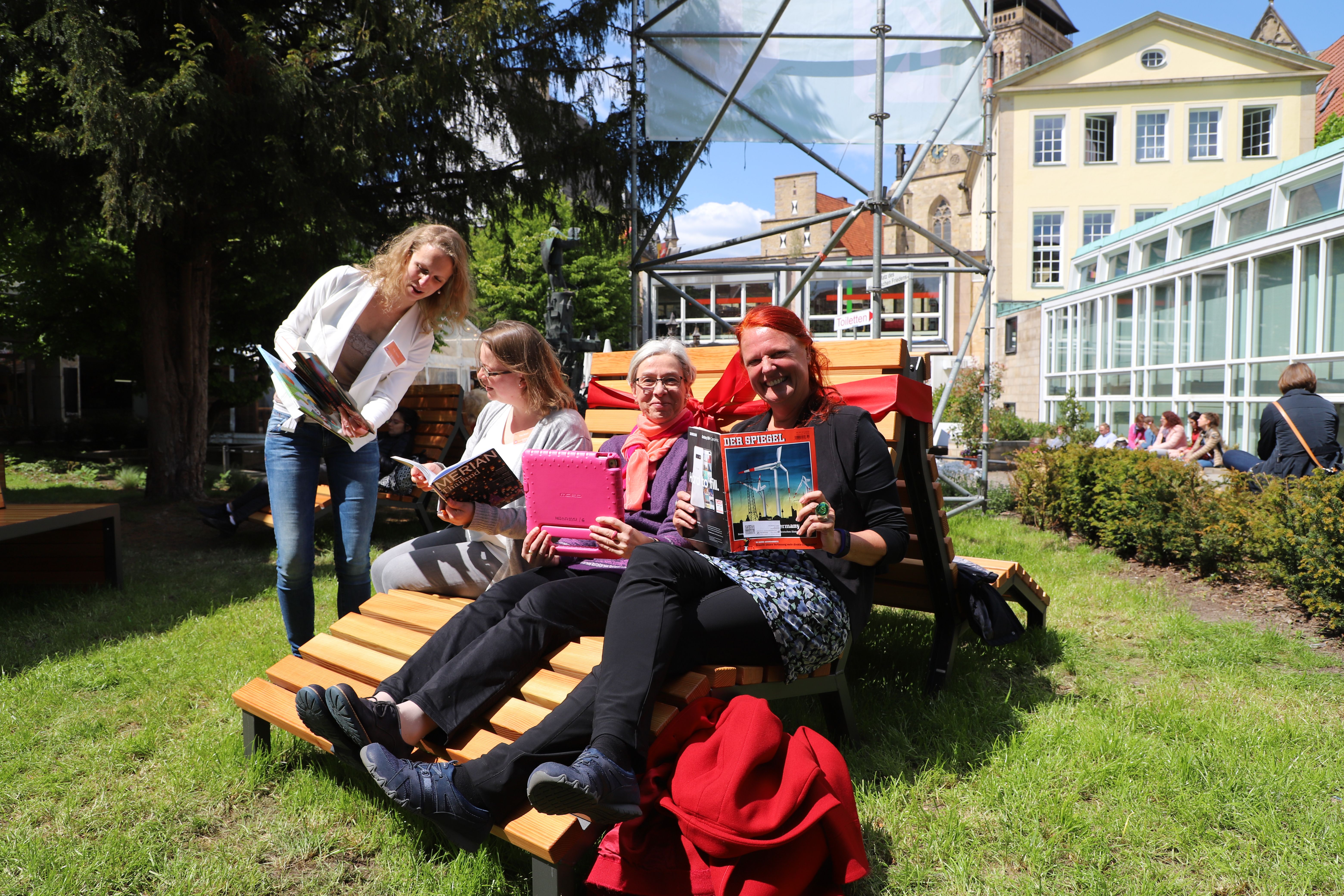 Genießen die Vorzüge des neuen Lesegartens: (von links) Sybille Kiwitz, Carolin Busch, Martina Dannert (alle Stadtbibliothek) und Patricia Mersinger (Leiterin des Fachbereichs Kultur).