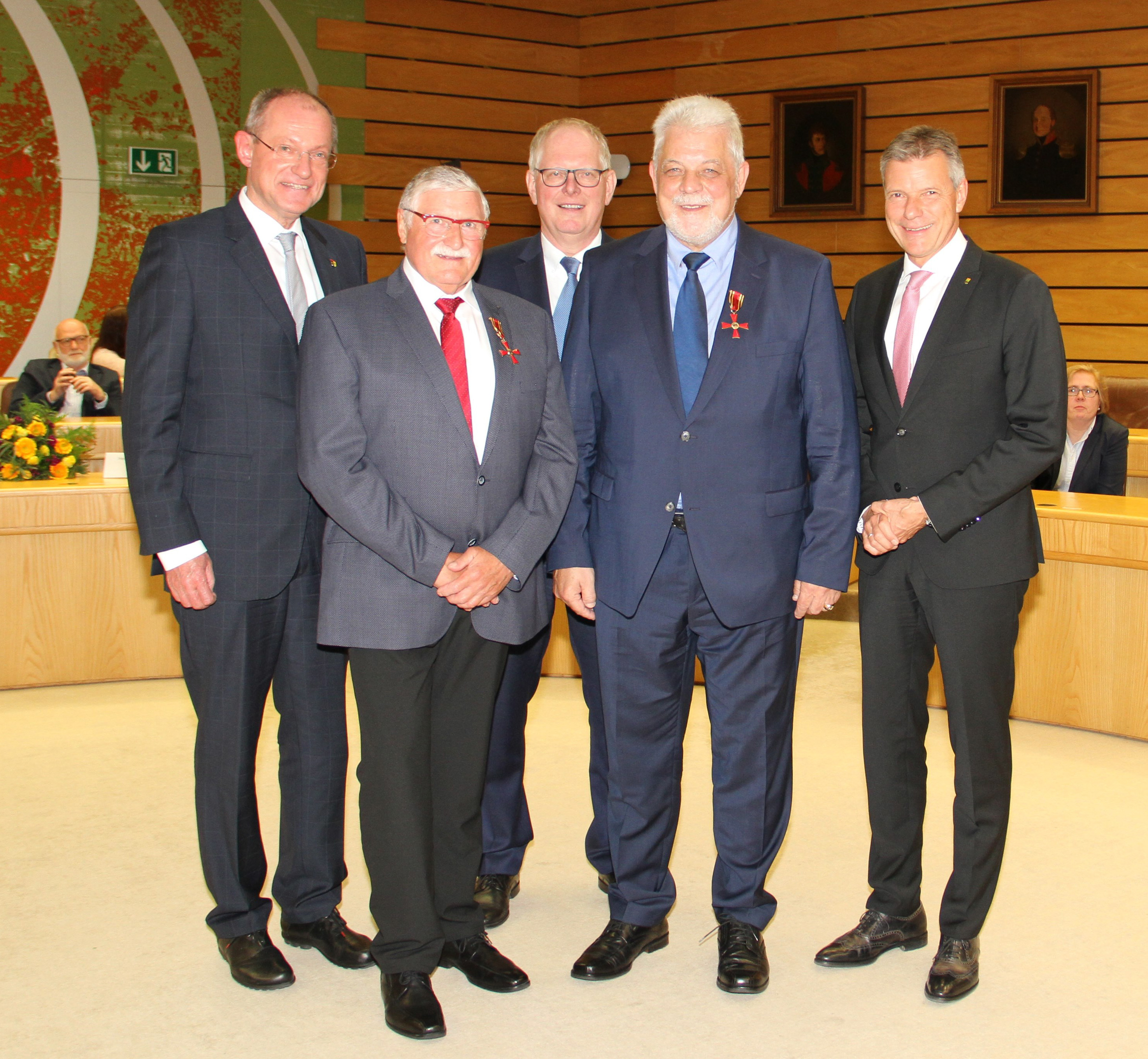 Die Träger des Verdienstkreuzes am Bande Walter Hüßhoff (2. v. l.) und Hans-Otto Matthey (2. v. r.) gemeinsam mit Landrat Cay Süberkrüb (m.) und den Bürgermeistern Ulrich Roland (l.) und Christoph Tesche (r.).