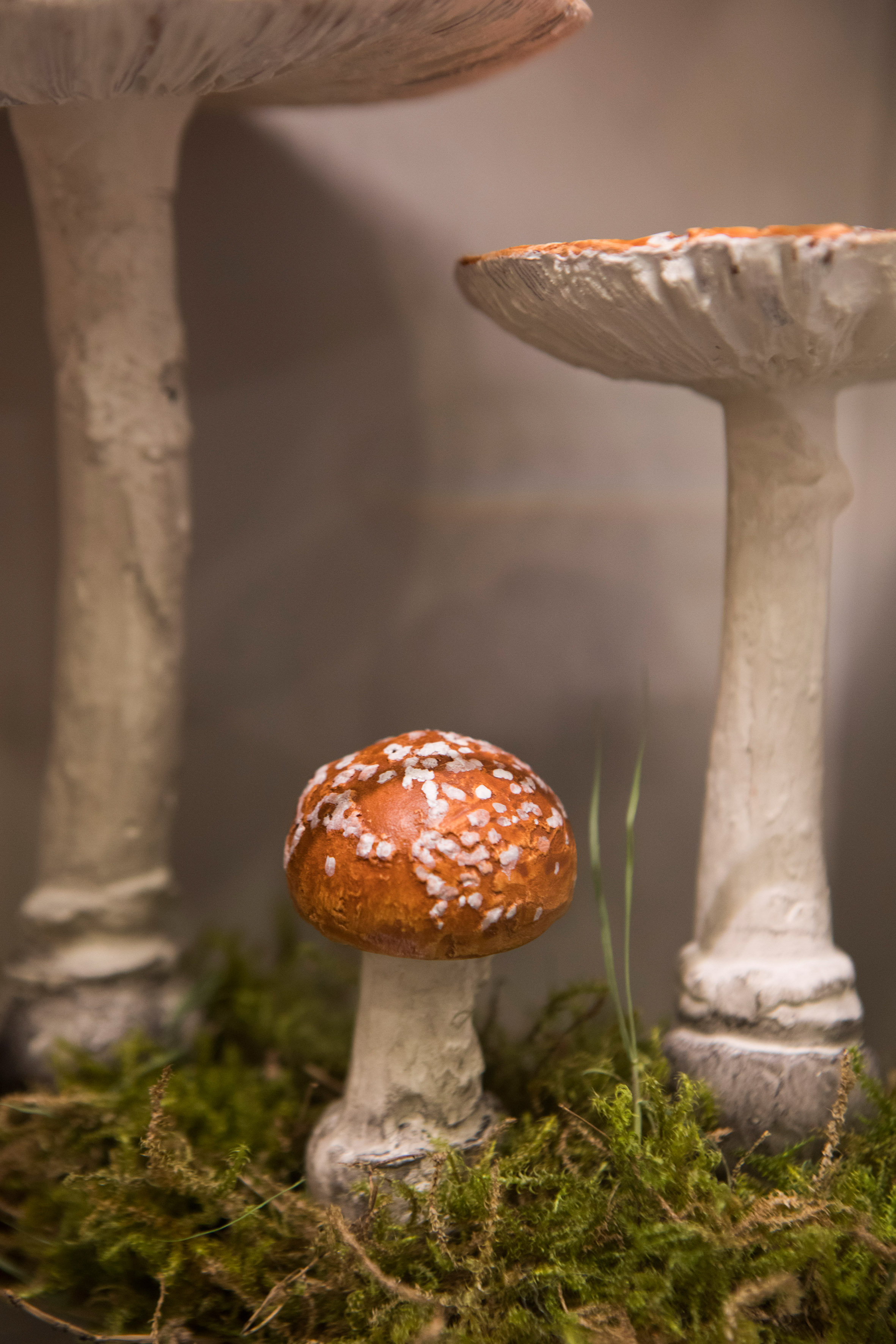 Pilzmodelle in der Ausstellung – Perlpilz (links) und sein giftiger Doppelgänger der Pantherpilz (rechts)