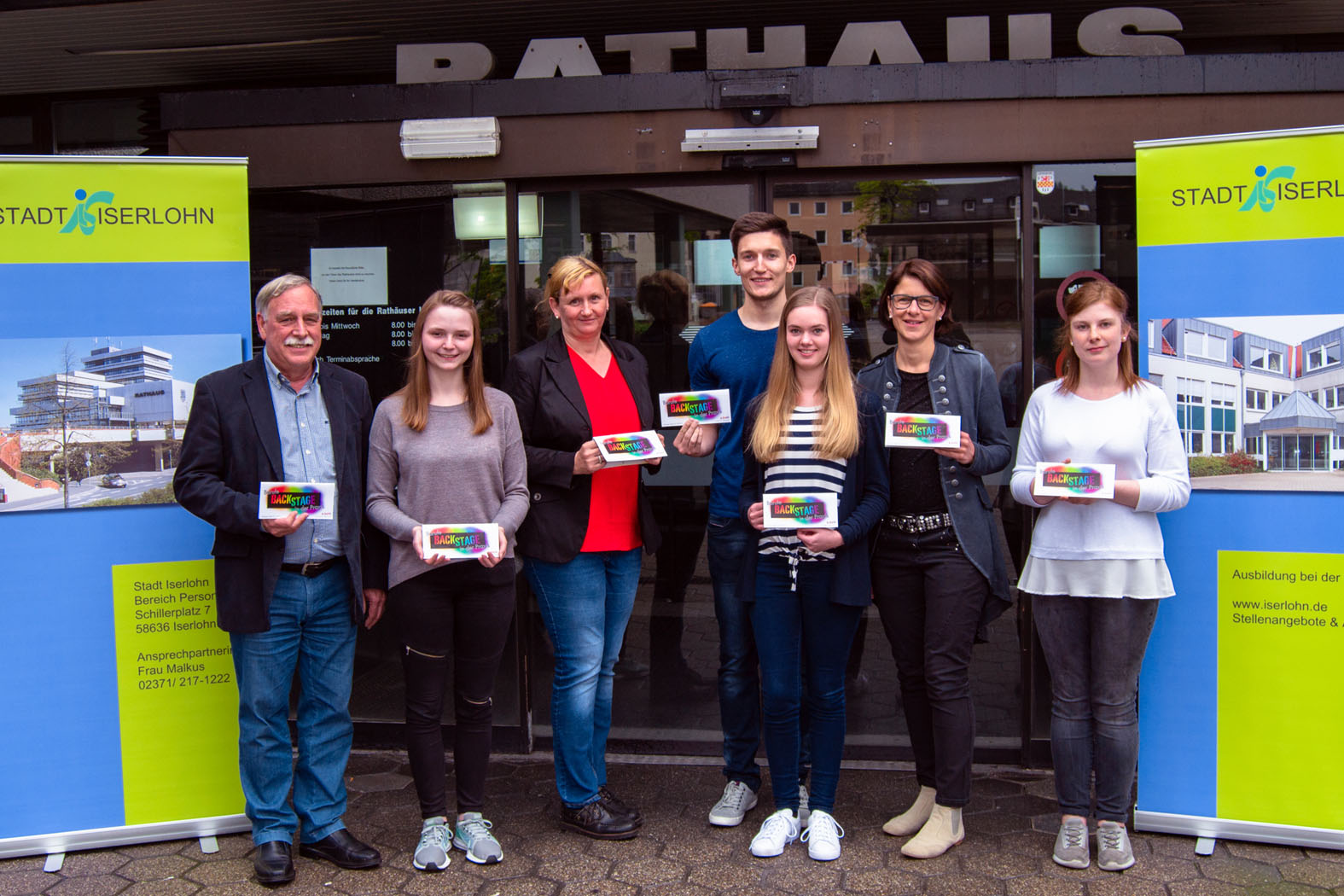 Die „backStage / backPack“-Koordinatoren Georg Christophery (l.) und Anke Göcking (3.v.l.) werben gemeinsam mit den Auszubildenden Laura Weigelt, Lars Bachmann und Daria Jodat, Ausbildungsleiterin Carmen Malkus und Auszubildender Silvana Heise (v.l.) für das Projekt zur Berufswahlorientierung für Schülerinnen und Schüler.
