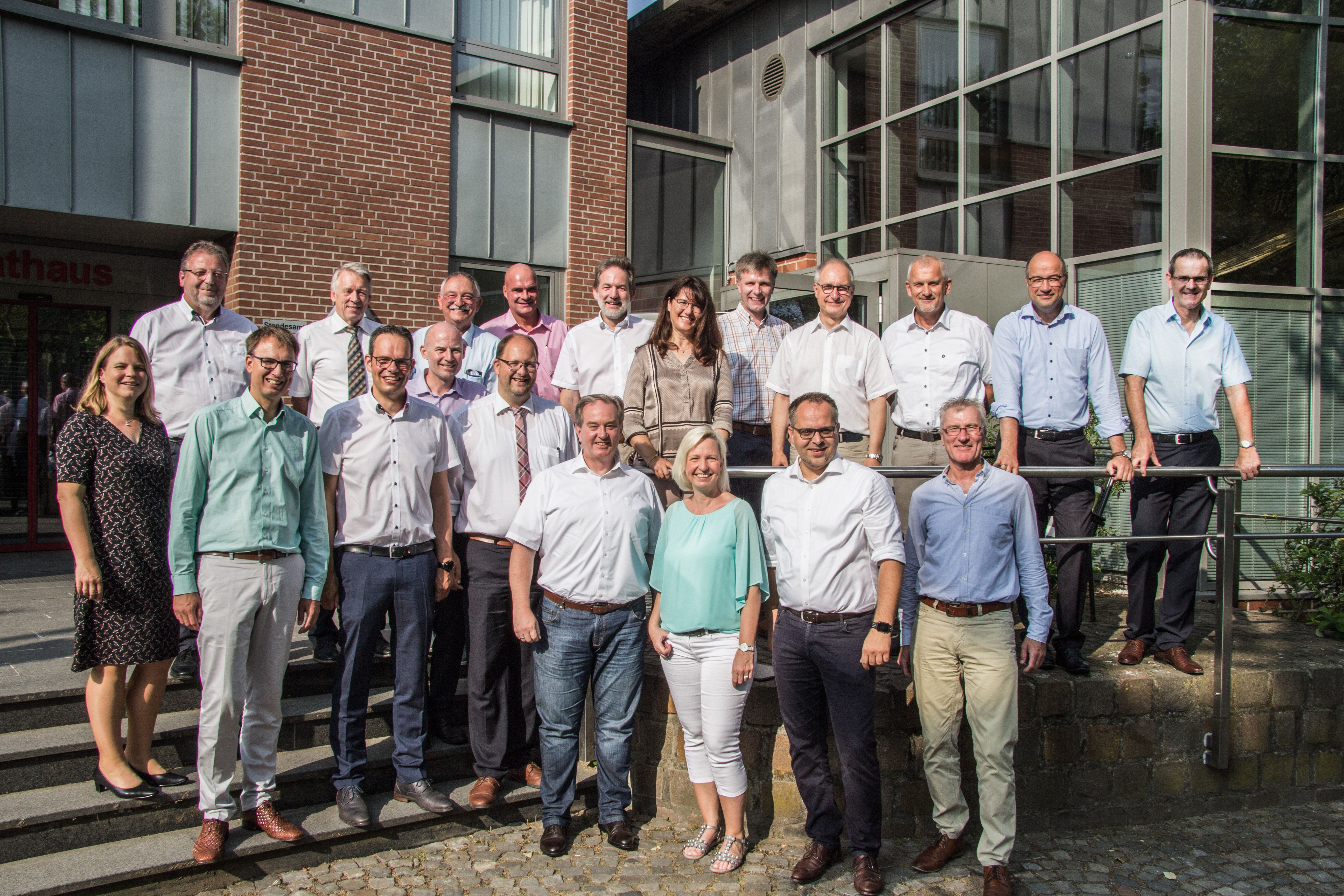 Die Teilnehmer der AG Bürgermeister/Beigeordnete vor dem Rekener Rathaus mit den Sprechern Dr. Christoph Holtwisch (vorne, 2. v. l.) und Andreas Grotendorst (3. v. l.) sowie Gastgeber Manuel Deitert (4. v. l.)