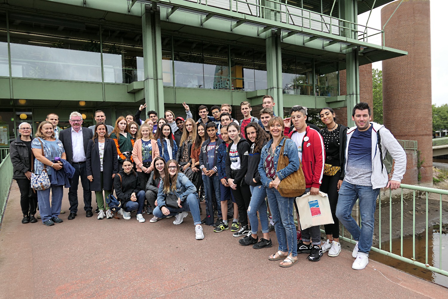 Bürgermeister Peter Nebelo (4. v.l.) empfängt die Teilnehmerinnen und Teilnehmer am europäischen Jugendcamp "So klingt Europa - Sounds of Bocholt!" am 15. Juli 2019 im Rathaus.