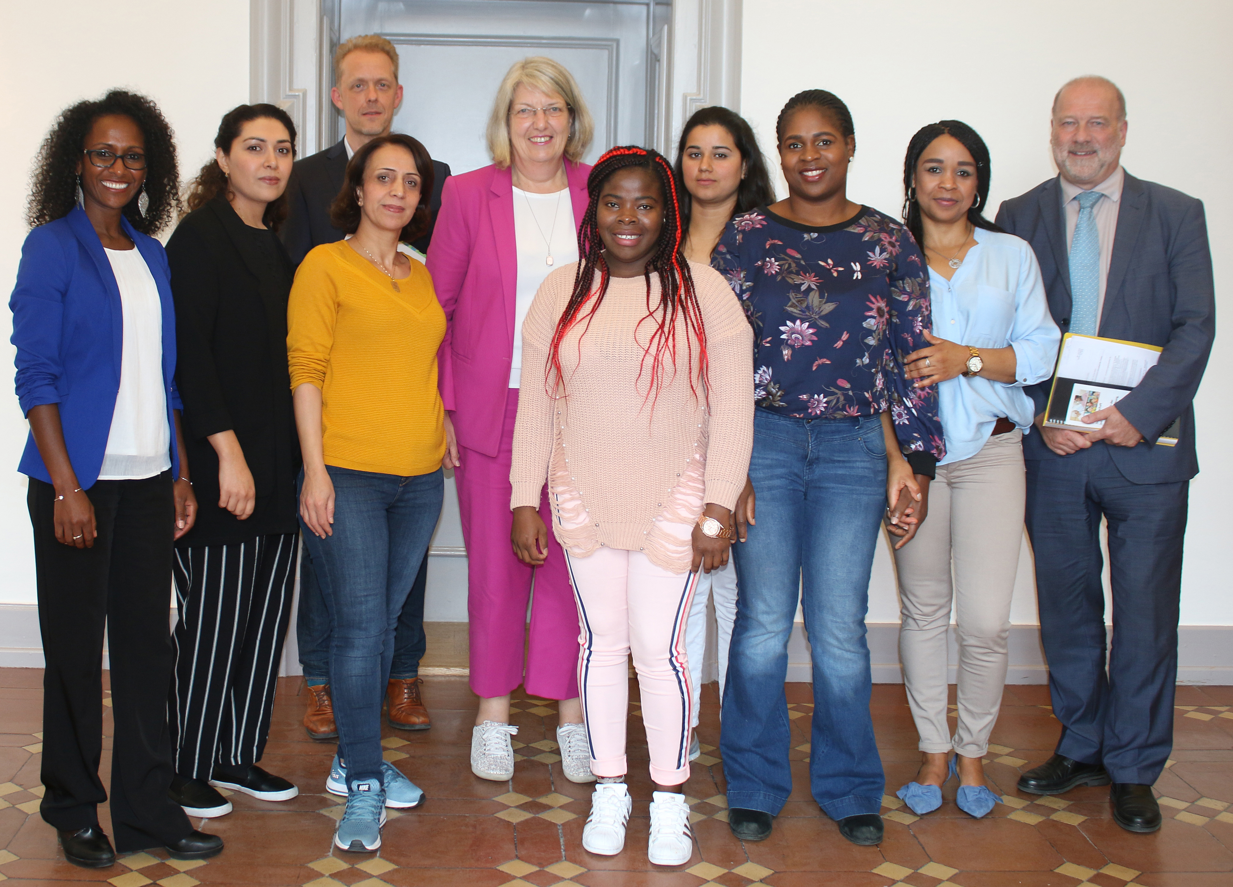 Die Stadt Kassel und die AWO bieten eine Ausbildung mit Perspektive speziell für Migrantinnen an: Projektleiterin Terhas Andezion, Maysaa Al-Shamsi, Jan Bendix (Stadt Kassel), Manwa Alhaj, Bürgermeisterin Ilona Friedrich, Millicent Serwah-Mensah, Deeba Parwani, Ulamaka Evelyn Eze, Habiba Schreiber und Michael Schmidt, AWO (v.l.n.r)