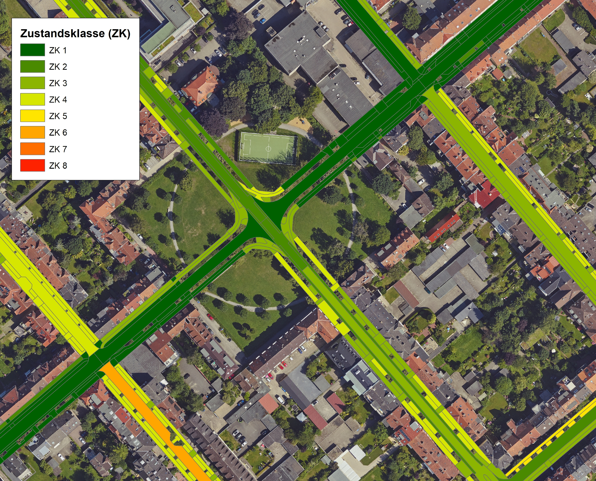 Eine solche Zustandskarte (hier aus der Befahrung 2013 im Bereich Hoffmeyerplatz) lässt sich mit den gesammelten Daten erstellen.