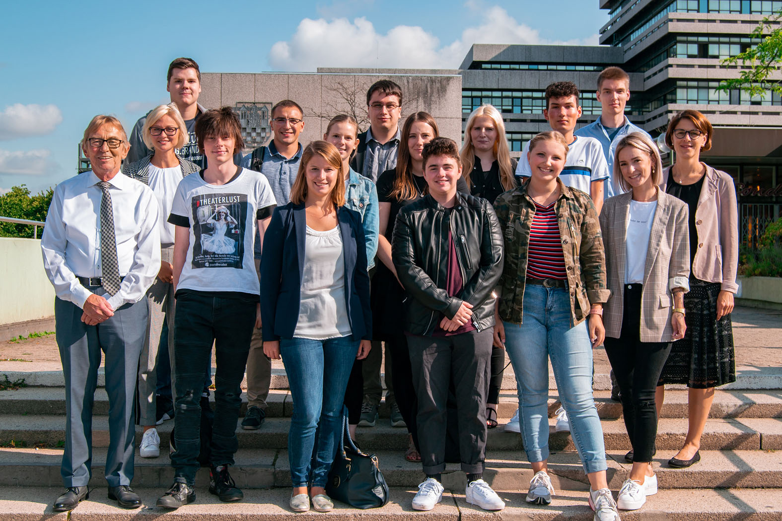 Bürgermeister Dr. Peter Paul Ahrens (l.) begrüßte zusammen mit Ausbildungsleiterin Carmen Malkus (r.) die neuen Auszubildenden im Iserlohner Rathaus.