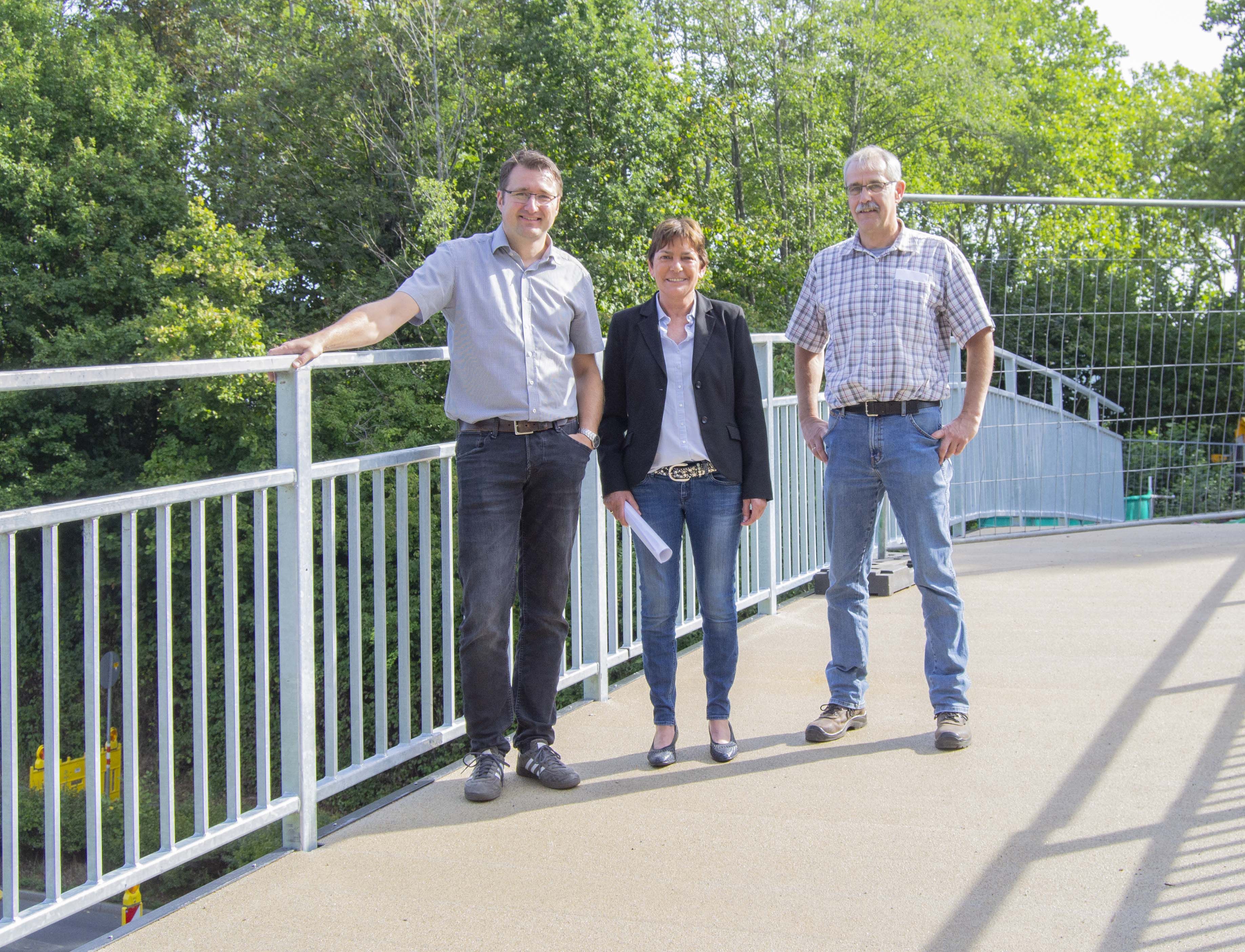 Von links: Stefan Thiemann, Leiter des Bereiches Infrastruktur, Medienreferentin Christine Schulte-Hofmann und Bauleiter Alexander Sprung von der Abteilung Straßen und Brücken erläuterten im Rahmen eines Pressetermines die Sanierungsarbeiten im Einzelnen und kündigten die Freigabe der Brücke für den 23. August an.