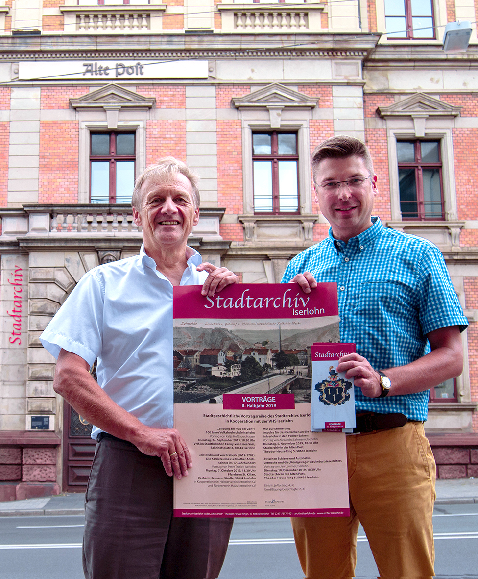 Kulturressortleiter Jochen Köhnke (links) und Stadtarchivar Rico Quaschny präsentieren das neue Vortragsprogramm des Stadtarchivs Iserlohn. (Foto: Stadt Iserlohn)
