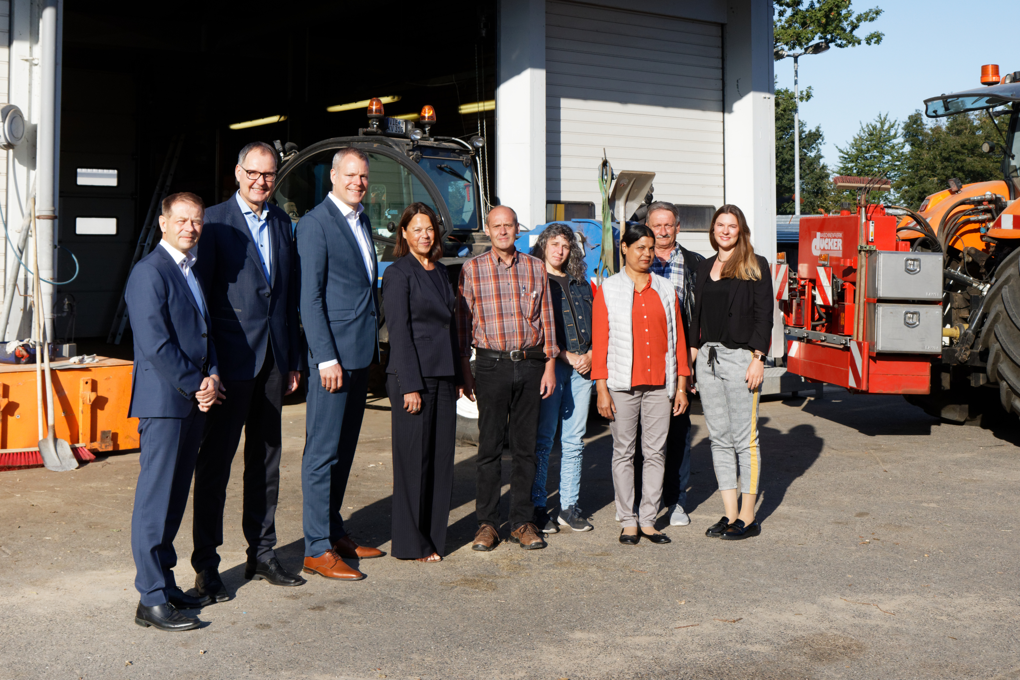 Landrat Dr. Andreas Coenen (3.v.l.) begrüßte gemeinsam mit dem Geschäftsführer des Jobcenters Kreis Viersen, Franz-Josef Schmitz (2.vl.), der Vorsitzenden der Trägerversammlung des Jobcenters, Sozialdezernentin Katarina Esser (4.v.l.), dem Dezernenten für Planen, Bauen und Umwelt, Andreas Budde (l.) und Jobcenter-Betriebsaquisiteurin Ruth Pakusch (r.) die ersten vier Beschäftigten Thomas Simons, Jutta Beckers, Sulekha Roy und Manfred Schattenkerk (5.-8.v.l.). Foto: Kreis Viersen / Abdruck honorarfrei