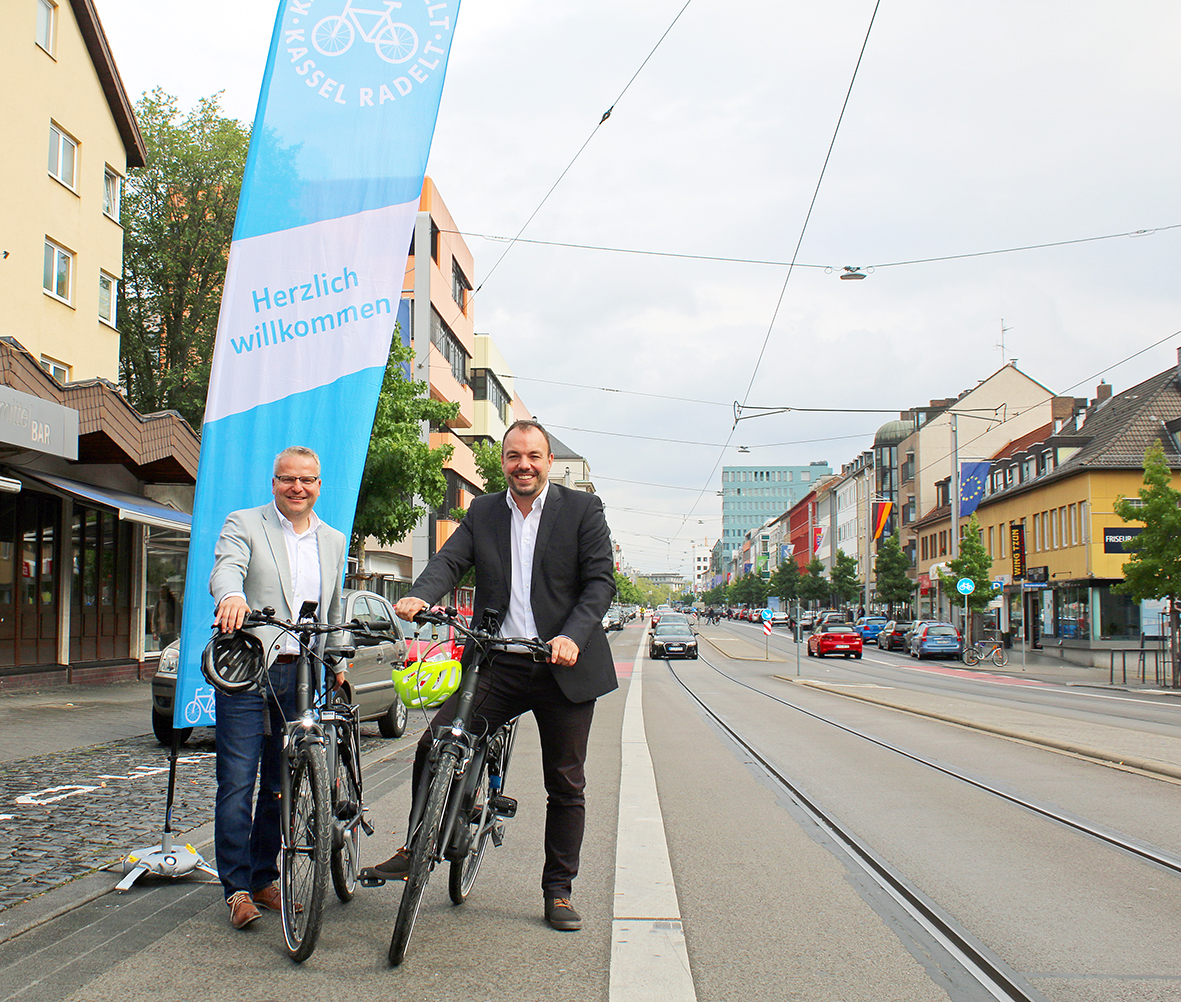 Verkehrsdezernent Dirk Stochla (links) und Oberbürgermeister Christian Geselle stellten das Programm für "Kassel radelt" am 22. September 2019 vor. Foto: Stadt Kassel/Christina Hartmann