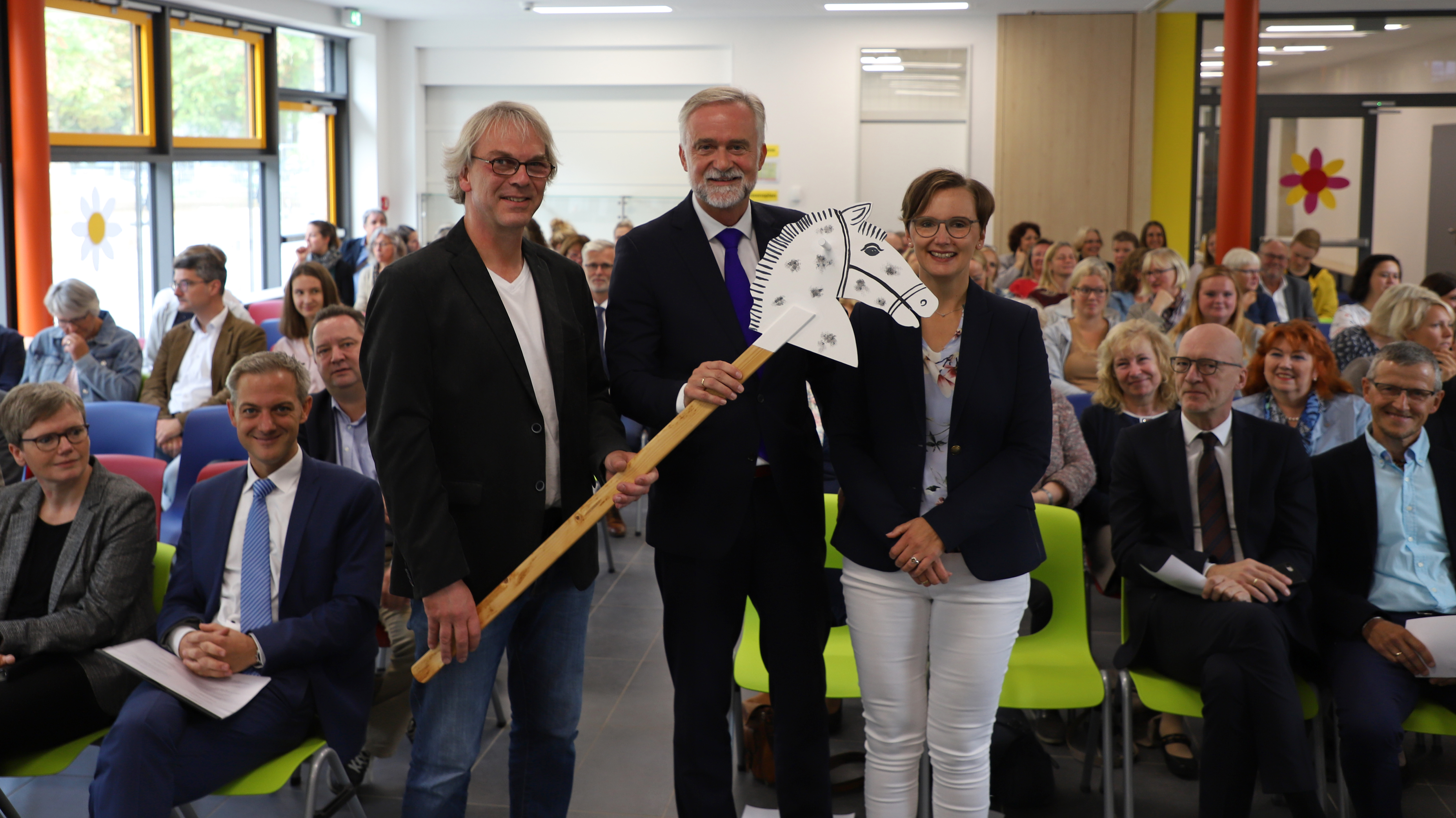 Oberbürgermeister Wolfgang Griesert (Mitte) überreicht dem Lehrer Heinrich Haker und Schulleiterin Silvia Bielefeld ein weißes Steckenpferd – es soll der einzige Schimmel in der Grundschule Hellern bleiben.