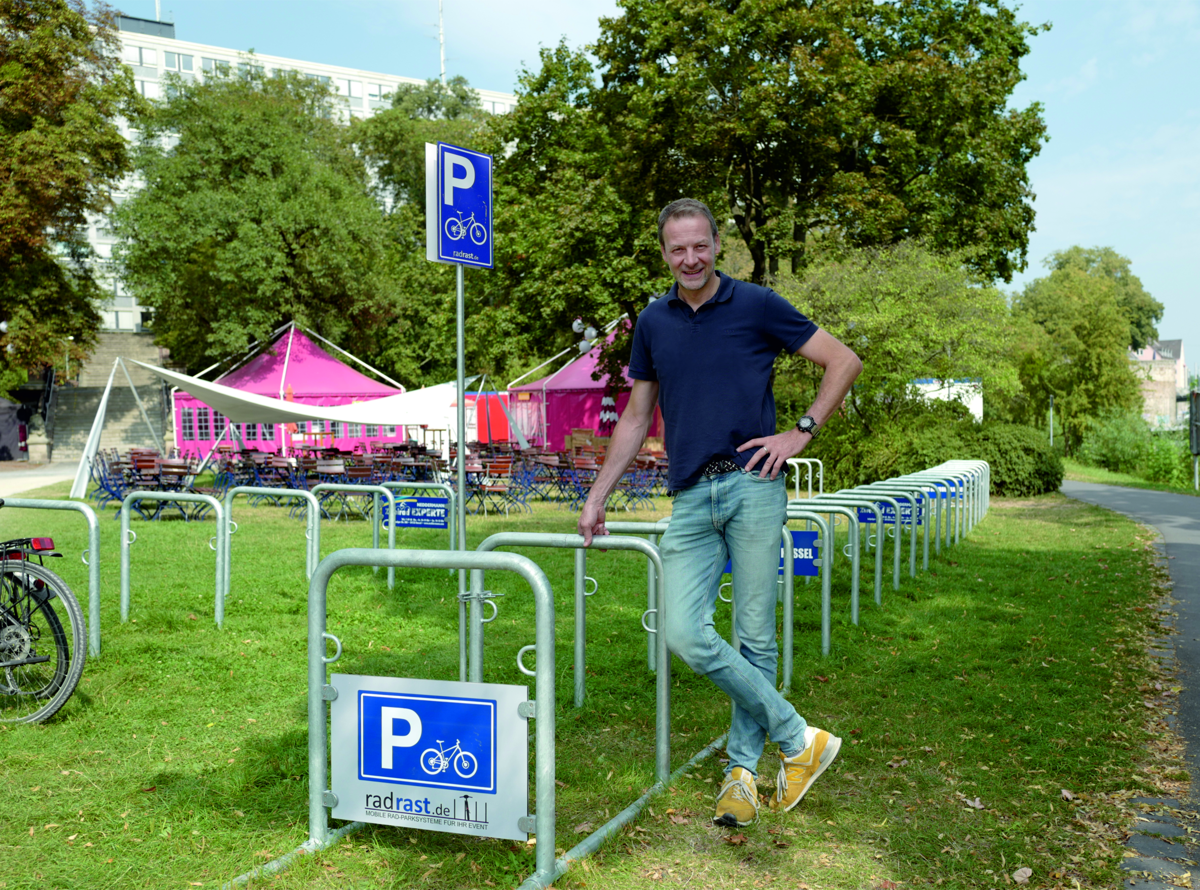 Karl Börries (Radrast) präsentiert die mobilen Fahrradständer, die in großer Zahl bei Kassel radelt am 22. September eingesetzt werden.
