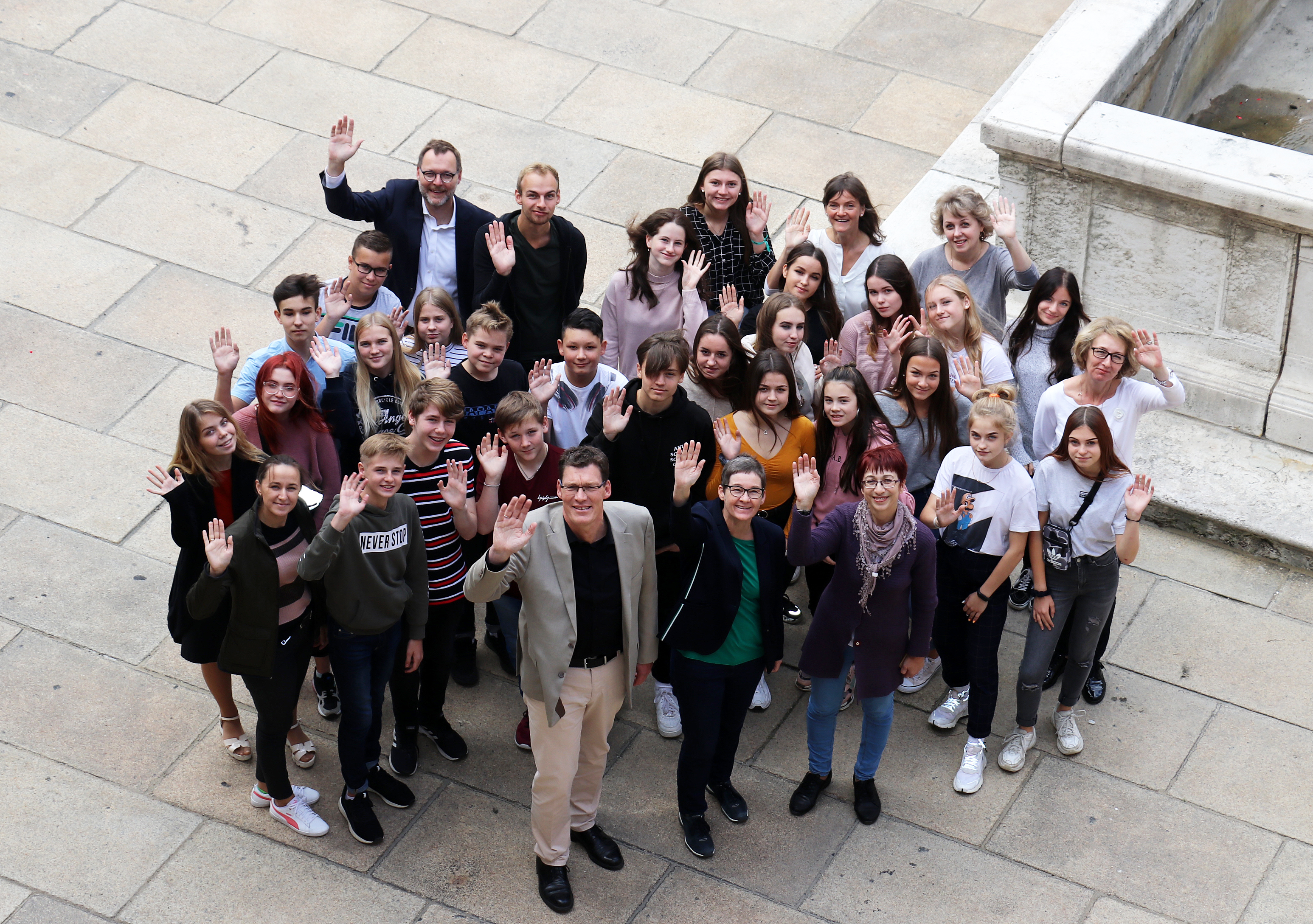 Stadträtin Ulrike Gote (vorn in der Mitte) begrüßte die Schülerinnen und Schüler aus Jaroslawl und ihre Gastgeber vom Goethe-Gymnasium.