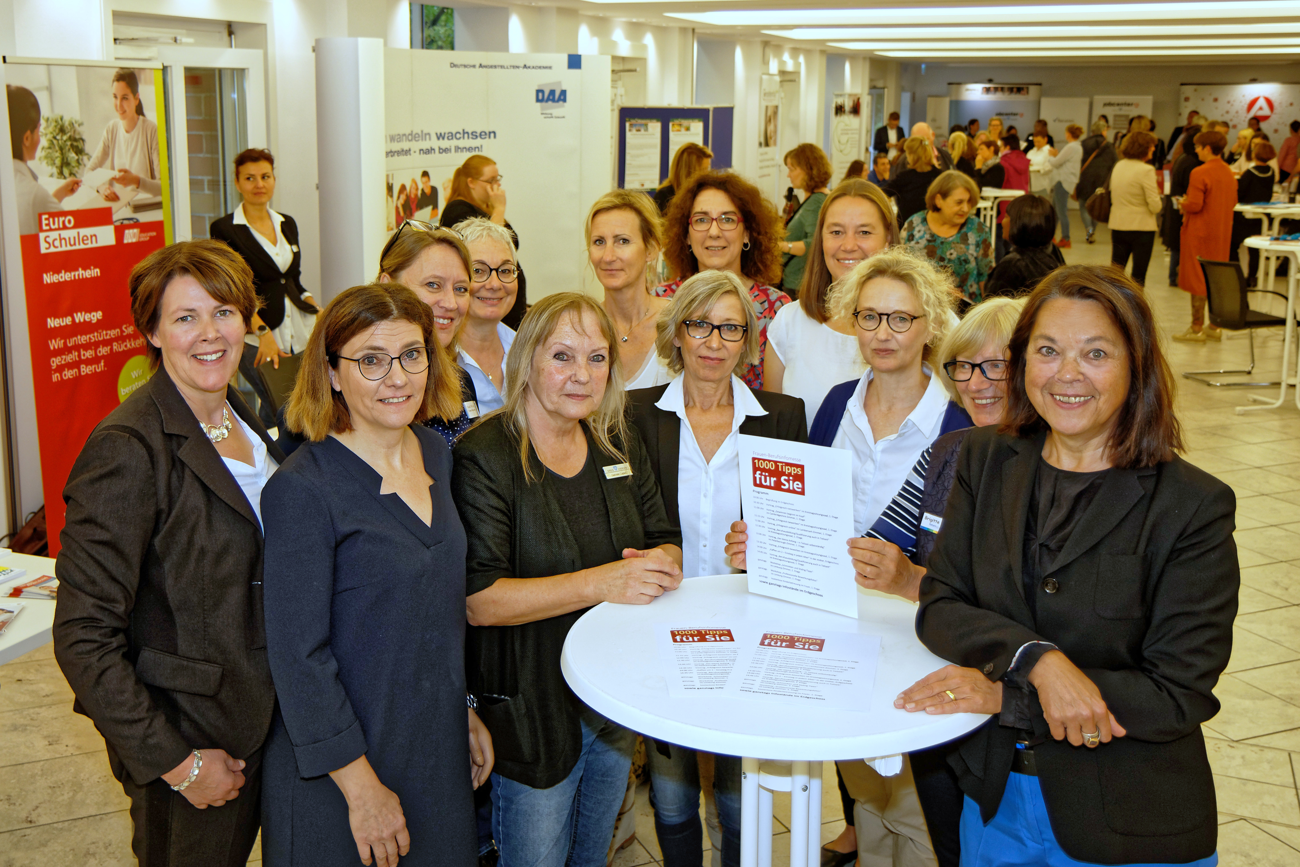 Sozialdezernentin Katarina Esser (r.) und das Organisationsteam der Frauen-Berufsinfomesse freuten sich über rund 200 Besucherinnen, die ins Forum des Kreishauses gekommen waren. An 33 Ständen und in Vorträgen informierten Referentinnen und Referenten über Möglichkeiten des (Wieder-)Einstiegs in den Beruf. Foto: Kreis Viersen / Abdruck honorarfrei