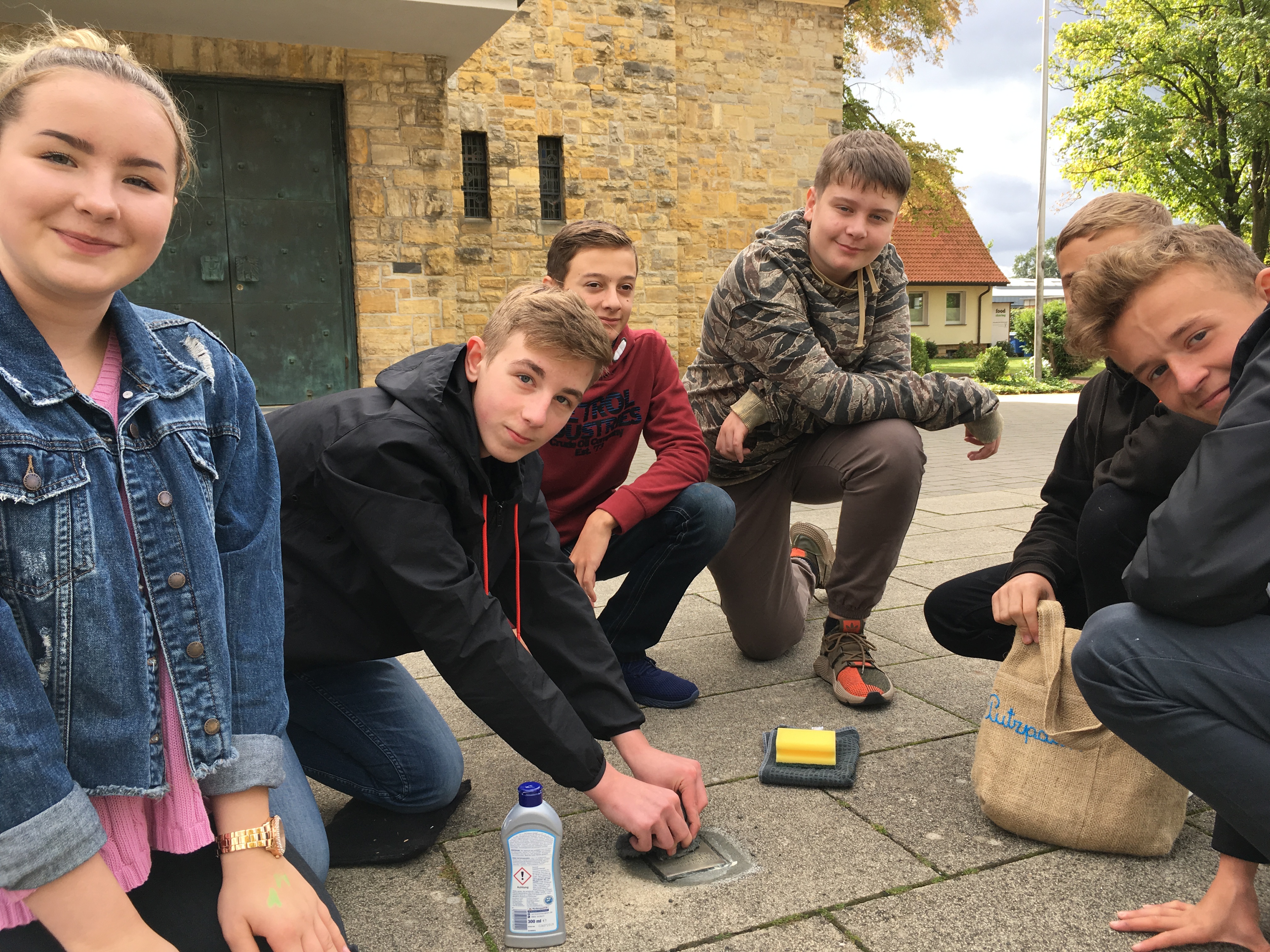Schülerinnen und Schüler der Thomas-Morus-Schule erproben schon einmal die Reinigung der Stolpersteine. (Von links) Viktoria Hartung, Maximilian Lakmann, Kilian Fluhr, Nils Kowalewski, Emilio La Rosa und Janno Christ.