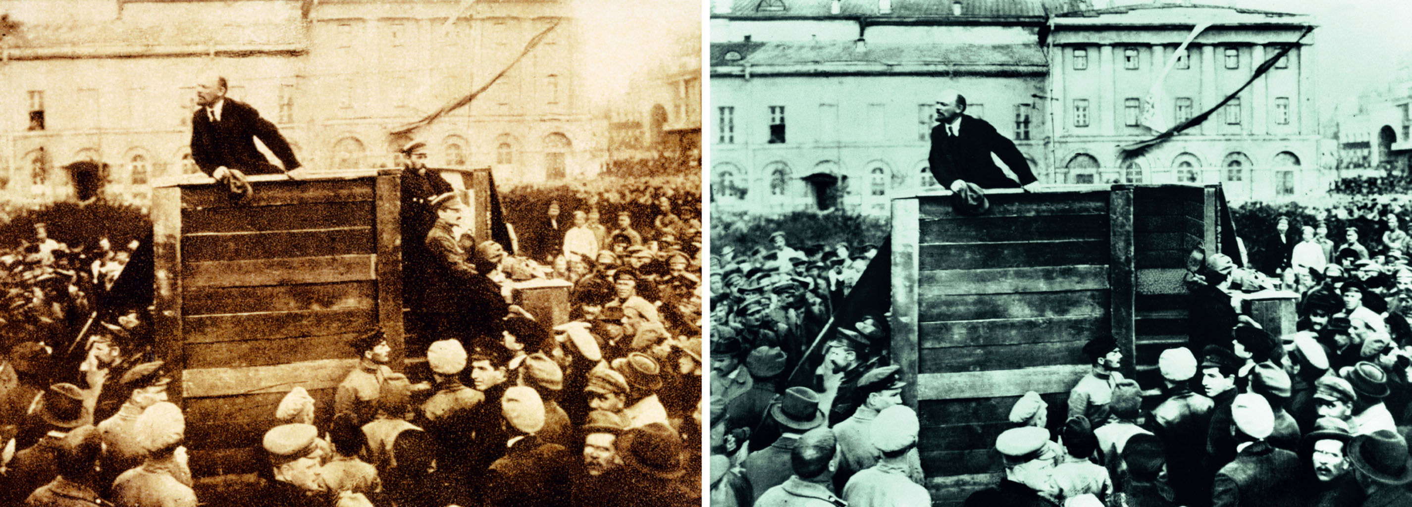 Früh gab es bereits die politisch motivierte Bildmanipulation. Stalin und Lenin zum Beispiel ließen oft unliebsam gewordene Menschen nachträglich aus den Fotos retuschieren. 1920 hielt Lenin eine Rede in Moskau. Leo Trotzki und Lew Kamenew standen im Originalbild auf den Stufen des Podestes. Auf dem retuschierten Foto wurden beide übermalt und durch Holzstufen ersetzt. G.P. Goldstein: „Lenin spricht zu Rekruten der Roten Armee.“ Moskau, 20.05.1920