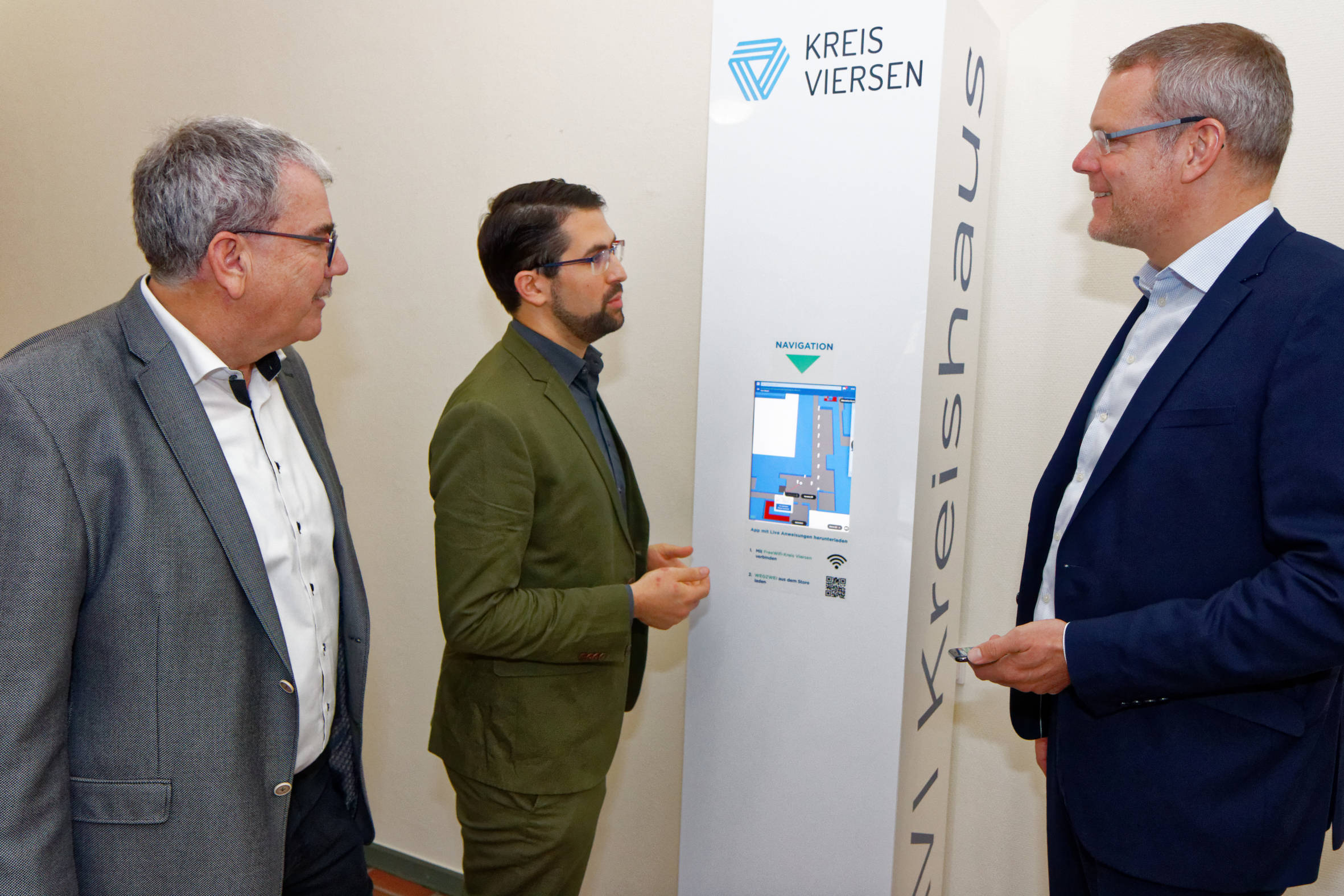 Maaged Mazyek (Mitte), Gründer von WEGZWEI, stellt Landrat Dr. Andreas Coenen (r.) und Bruno Wesch, Leiter des Gebäudemanagements Kreis Viersen, die digitale Navigation durch das Kreishaus vor. Die Infosäule befindet sich im Wartebereich des Gesundheitsamtes, Eingang 4. Foto: Kreis Viersen / Abdruck honorarfrei
