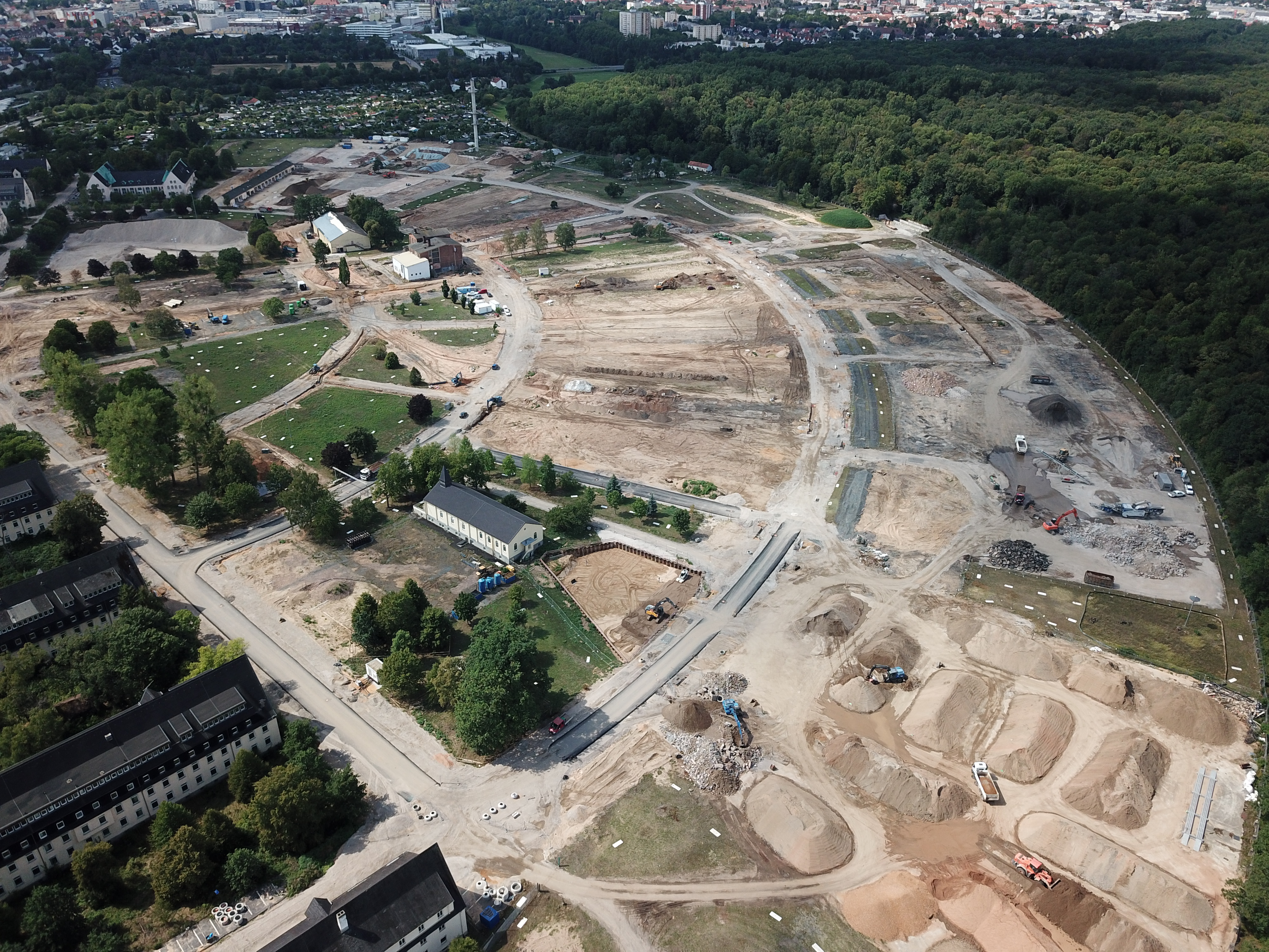 Die Erschließungsarbeiten laufen auf Hochtouren, die alten Lagerhallen sind inzwischen weitgehend abgerissen worden. (Luftbild Stand 08/2019)