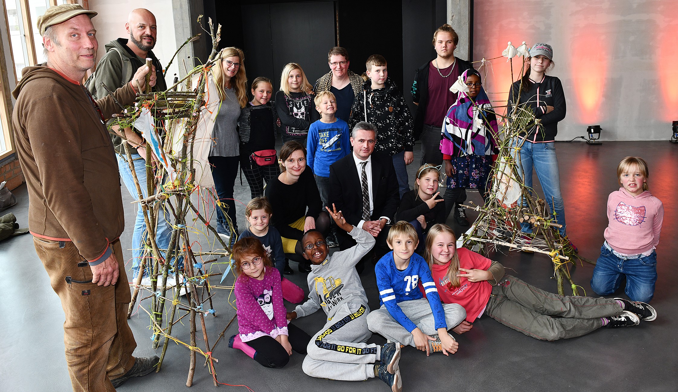 Die Kinder vom Hort am Mattenberg mit (v.l.n.R.) dem Künstler Christof Kalden und den Betreuern Thomas Brähler, Maike Thiele-Hanke und Tatjana Behnke sowie mit der Kulturdezernentin Susanne Völker und dem Leiter der Abteilung Marketing Development der WINGAS GmbH Dr. Markus Menges (vorne Mitte).