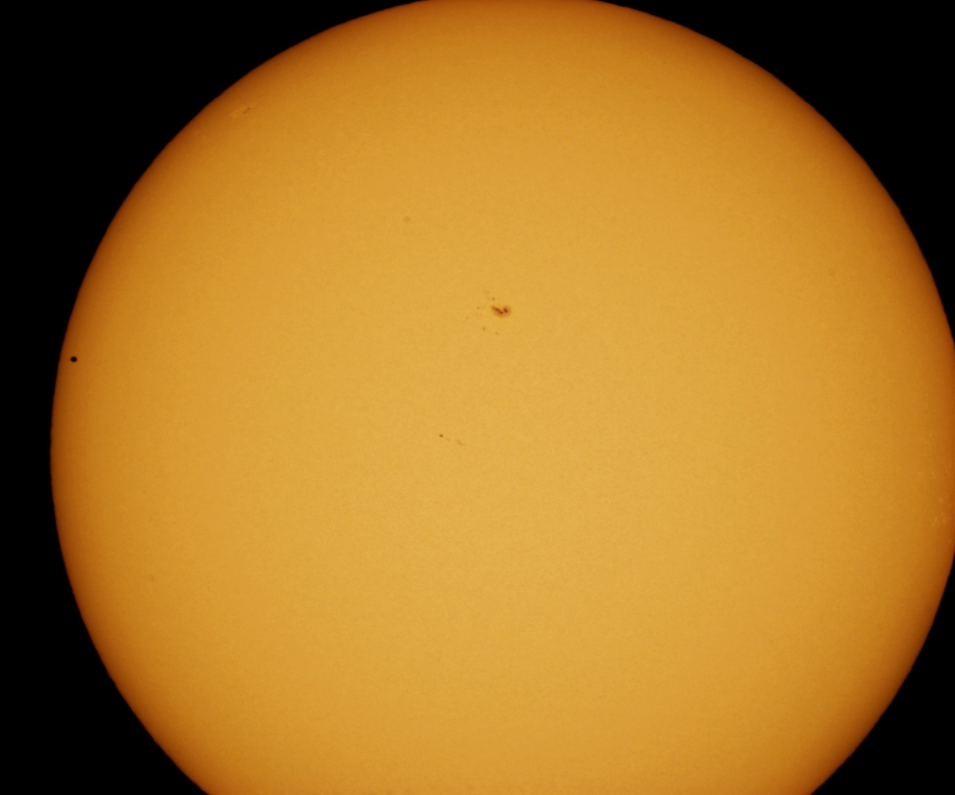 Aufnahme des Merkurtransits vom 9. Mai 2016. Der Planet Merkur ist als kleines dunkles Scheibchen am Rand der Sonne zu erkennen. In der Mitte der Sonnenscheibe sieht man einige Sonenflecken.