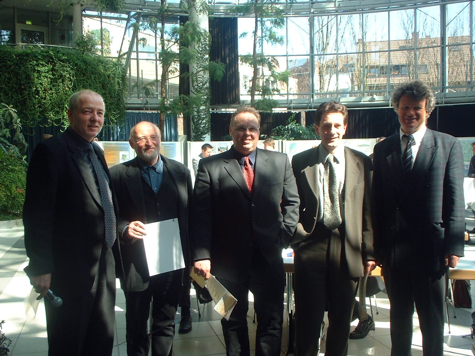 Bürgermeister Klaus Bechtel (l.) und Werner Lechner (r.) vom Städtebauministerium NRW verliehen die Preise an Alfred Luggenhölscher (3. Preis), Carsten Jasper (2. Preis) und Allessandro Dalpiaz (1. Preis)(v.l.).