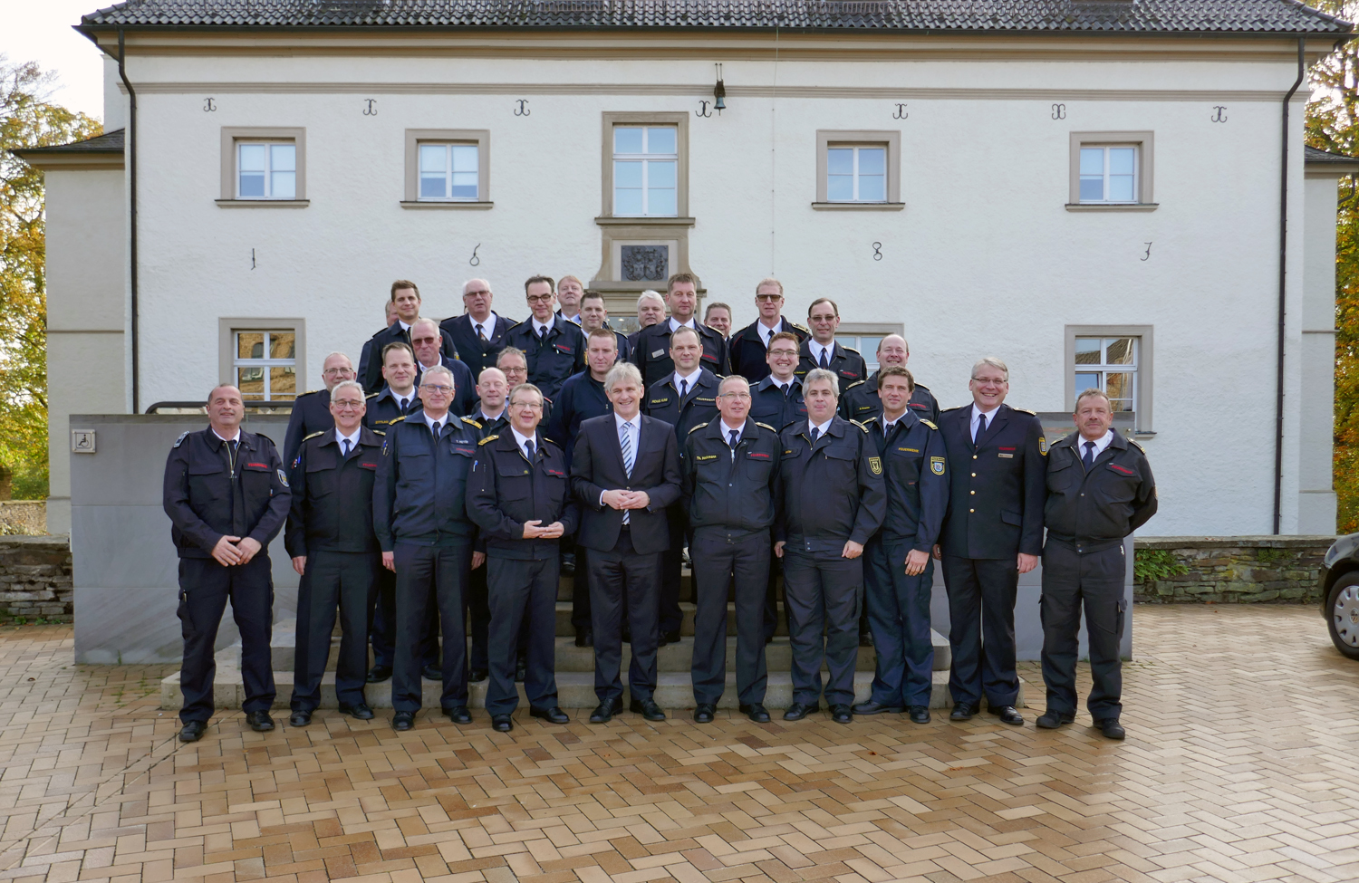 Bildzeile: Die Feuerwehr-Chefs vor Haus Opherdicke. Foto: Max Rolke - Kreis Unna