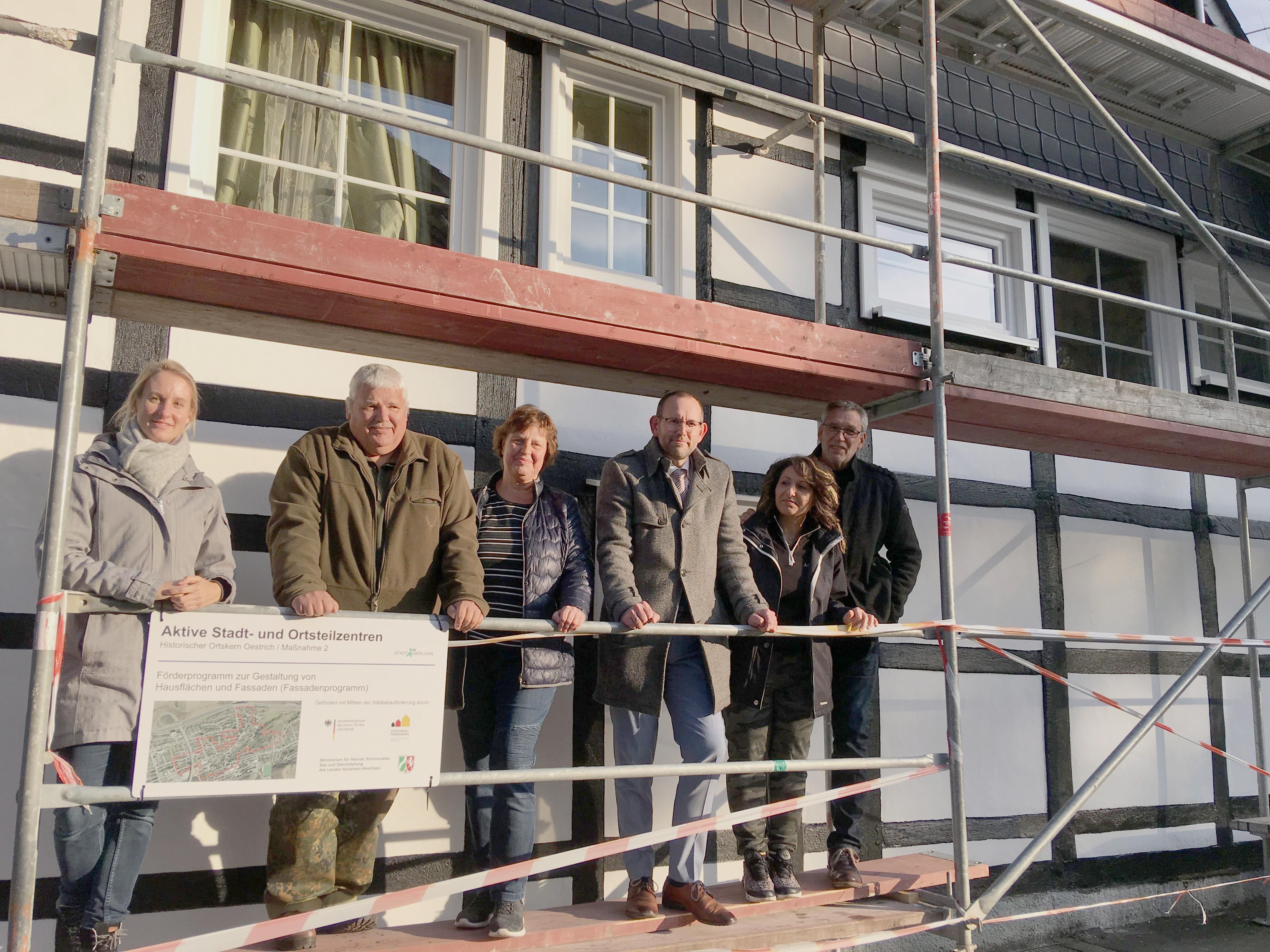 Von links: Britta Marscheider von der Abteilung Stadtentwicklung und Grundstücke, Heinz und Brigitte Burgman (Heimbergweg 4), Stadtbaurat Thorsten Grote sowie Hadil und Ralf Mark (Heimbergweg 2) stellten bei einem Pressetermin die gelungenen Sanierungen im Rahmen des Förderprogrammes vor.