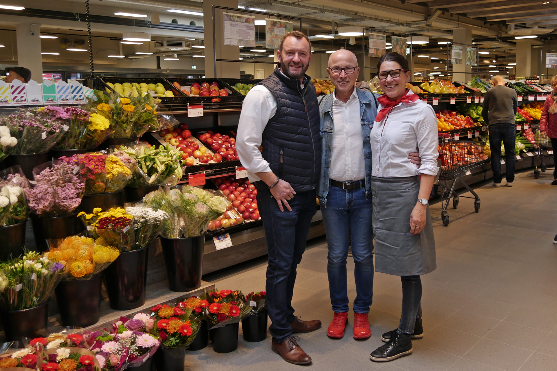 Bürgermeister Fred Toplak (in der Mitte) gratuliert den Marktleiter Marcus Engelhardt und Martina Engelhardt noch einmal persönlich.