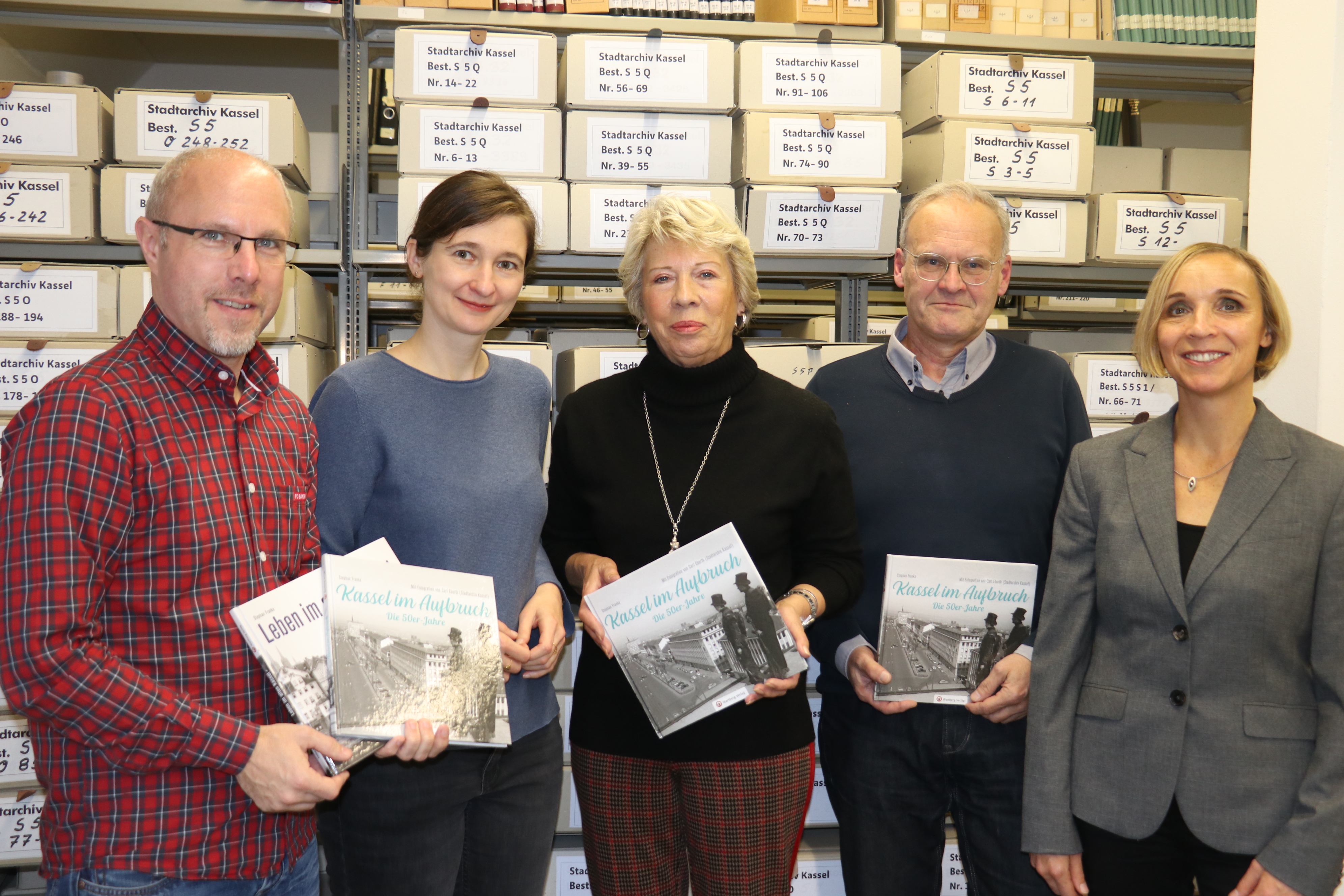 Buchvorstellung „Kassel- Stadt im Aufbruch“ im Stadtarchiv (v.l.n.r.): Leiter des Stadtarchivs Dr. Stephan Schwenke, Kulturdezernentin Susanne Völker, Rosemarie Eberth, Zeitzeugin und Tochter von Carl Eberth, Autor Stephan Franke und Lektorin Dörte Rienäcker vom Wartberg Verlag.