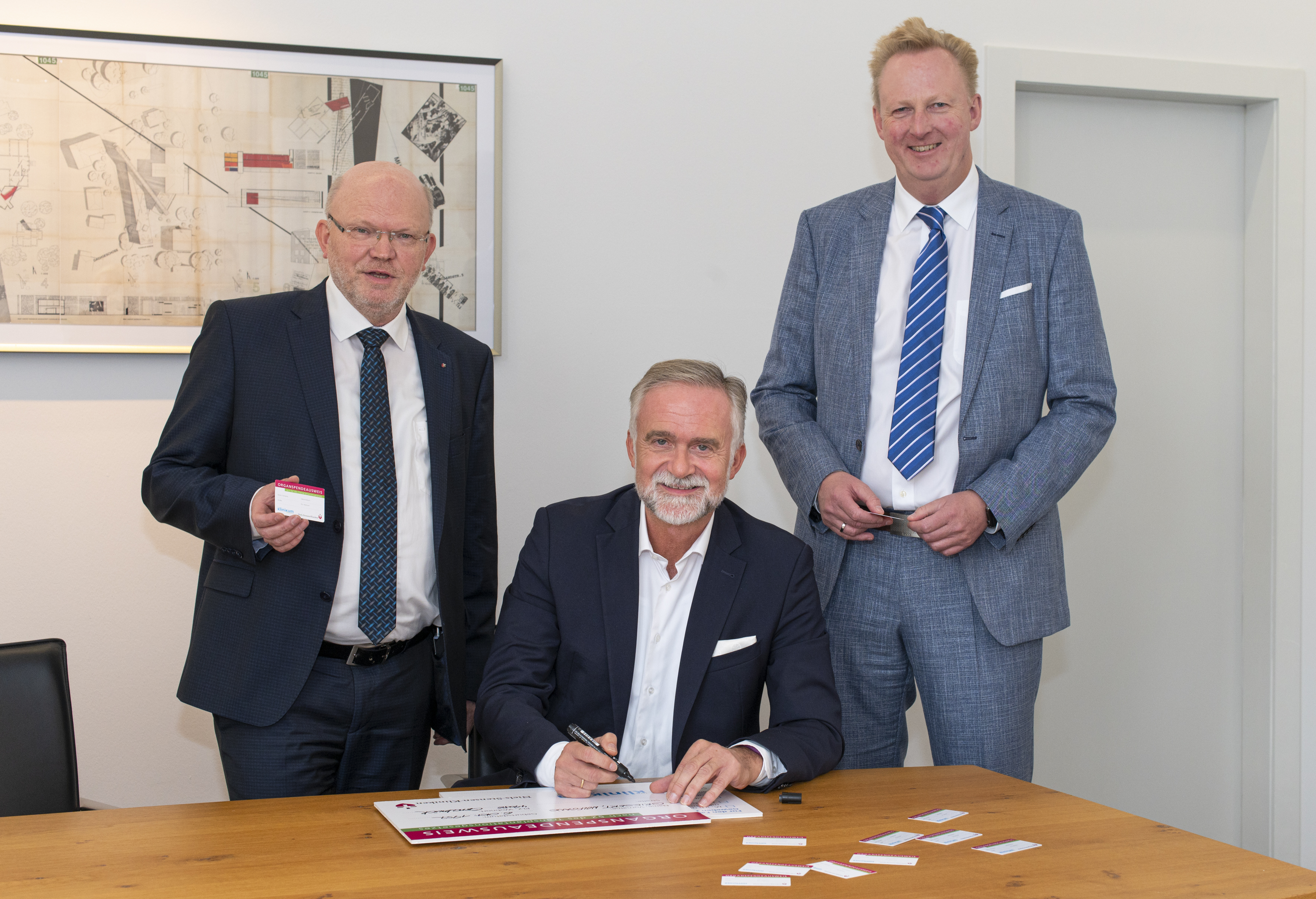 Oberbürgermeister Wolfgang Griesert unterschreibt im Beisein von Werner Lullmann, Geschäftsführer der Niels-Stensen-Kliniken, (li.) und dem Klinikum-Geschäftsführer Dr. Martin Eversmeyer einen symbolischen Organspendeausweis.
