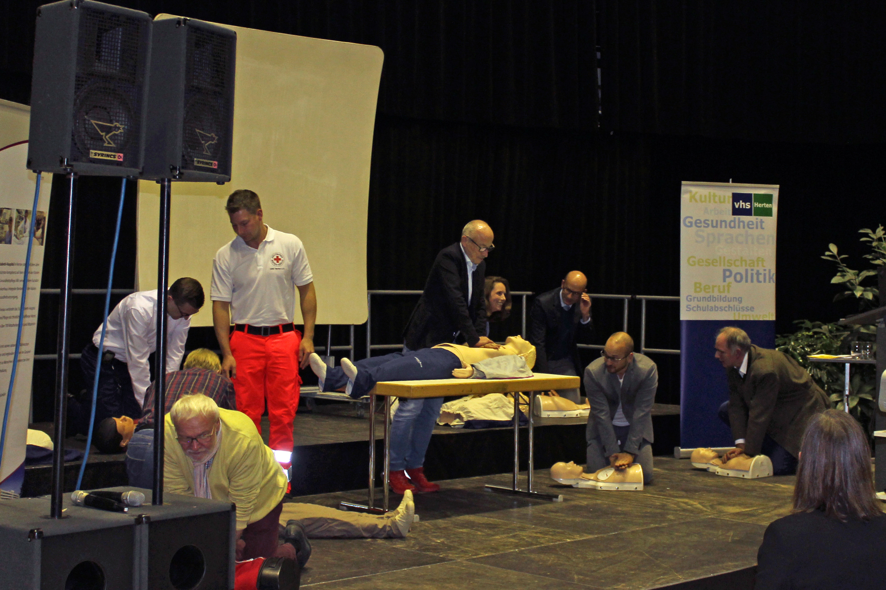 Bürgermeister Fred Toplak übt im Rahmen des Herzpatientenseminars 2019 im Glashaus eine Herzdruckmassage.