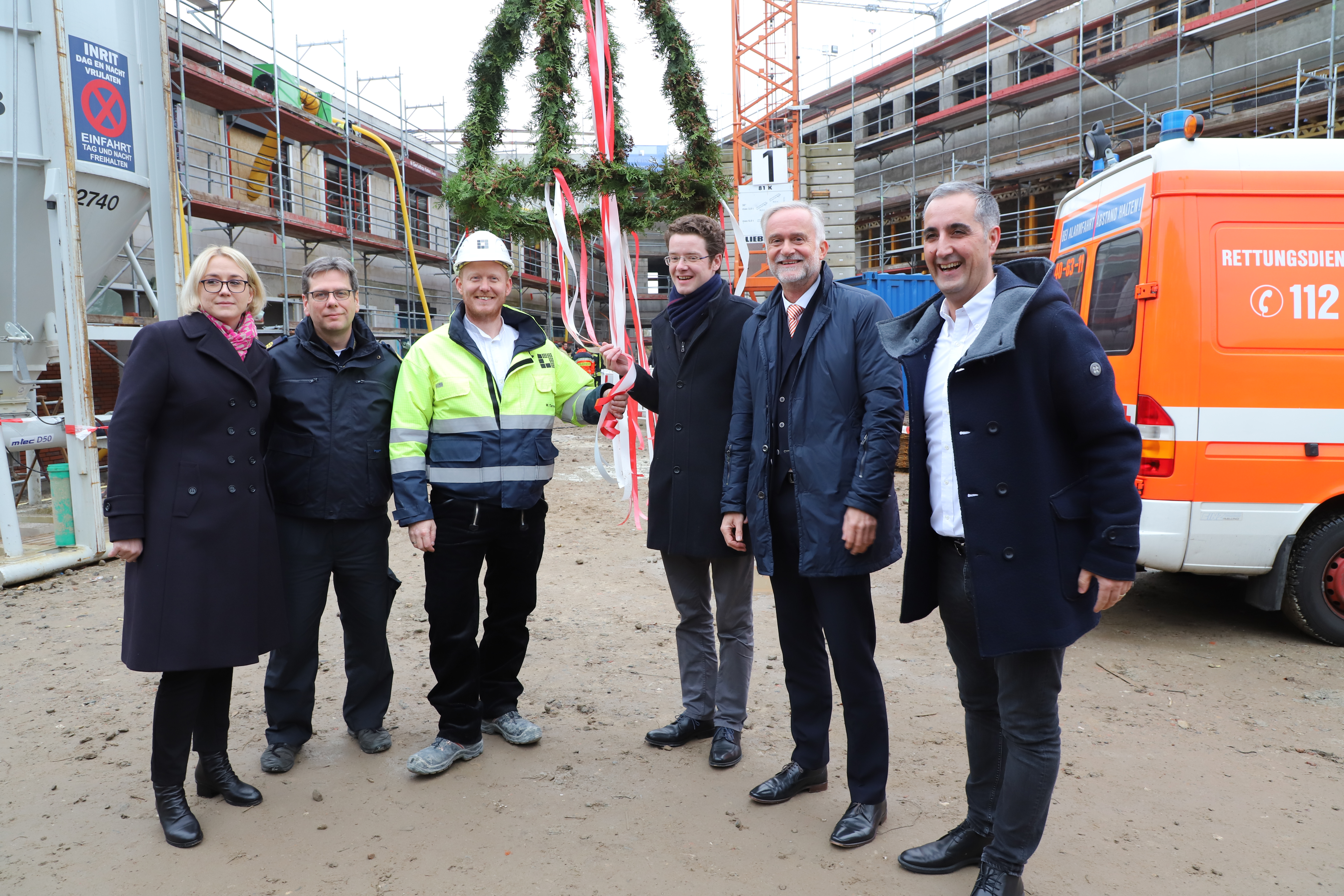(von links) Stadträtin Katharina Pötter, Dietrich Bettenbrock, Leiter der Feuerwehr Osnabrück, Wilhelm Tarner, Projektleiter Lühn Bau, Marius Keite, Vorsitzender des Ausschusses für Feuerwehr und Ordnung, Oberbürgermeister Wolfgang Griesert und Beyhan Ciftci, Geschäftsführer Lühn Bau, beim Richtfest der Feuerwache 2.