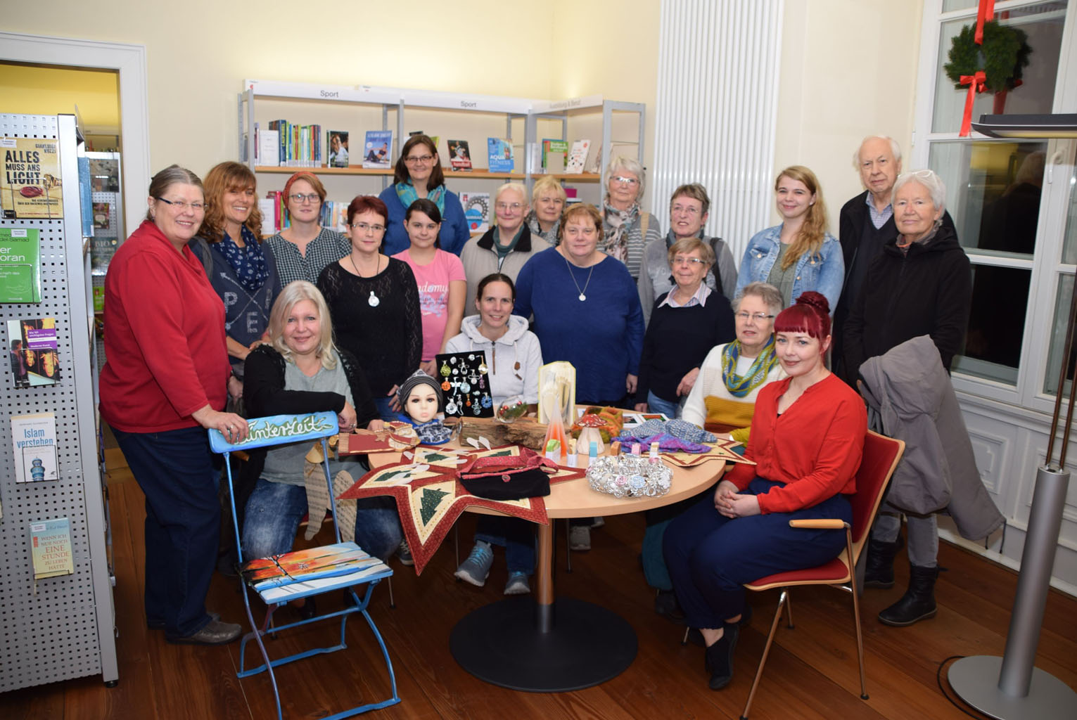 Büchereileiterin Stefanie Knippertz (vorne rechts) freut sich gemeinsam mit den Ausstellerinnen und Ausstellern auf viele Besucher des Weihnachtsmarktes im und am Haus Letmathe. Auch in diesem Jahr gibt es eine große Auswahl an selbst gefertigtem Kunsthandwerk, Handarbeiten, kulinarischen Leckereien und vielem mehr.