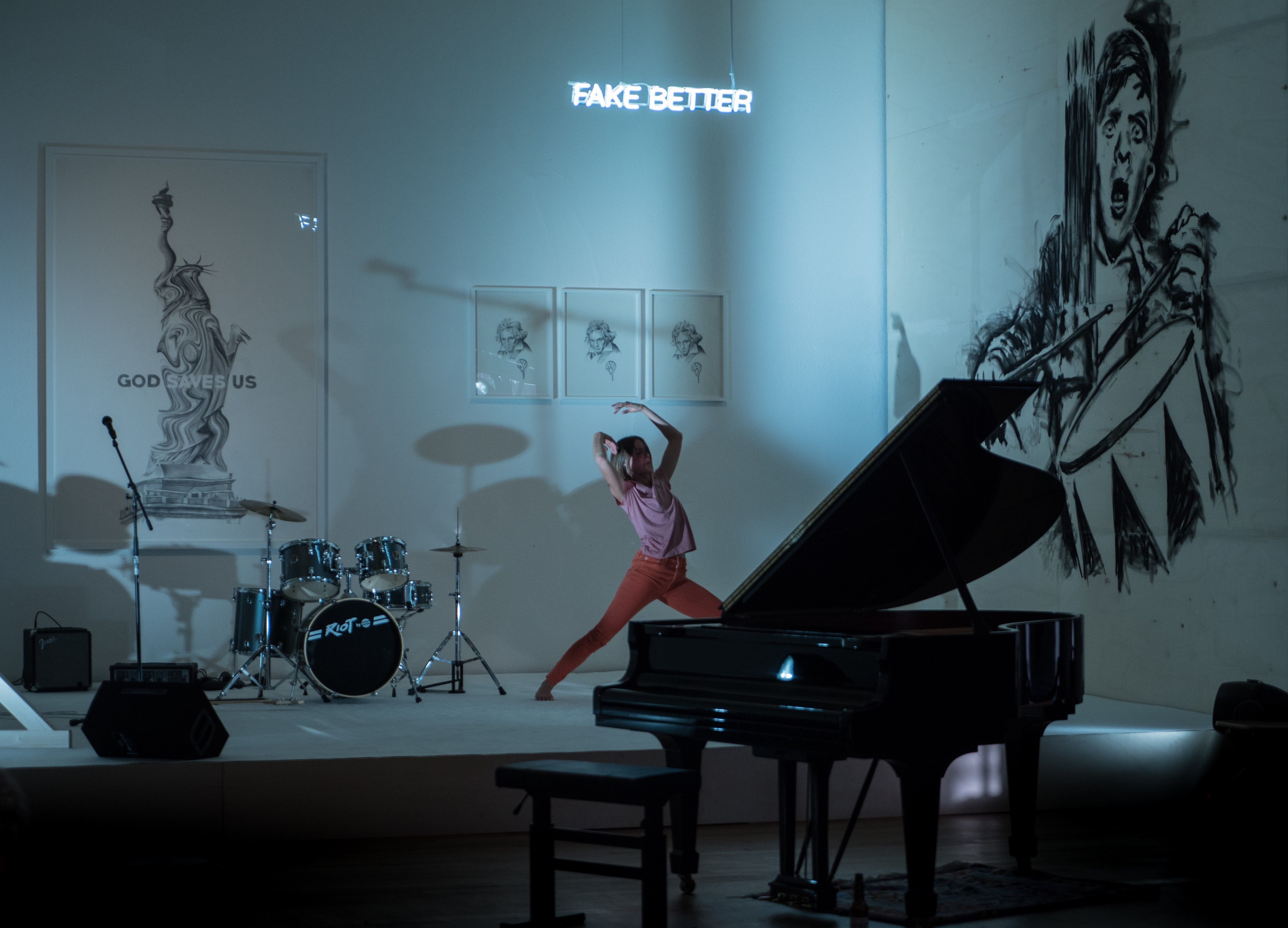 Filip Markiewicz: “Fake Better”, Installationsansicht im Casino Luxembourg (Performer: Tania Soubry) 2019 © Filip Markiewicz
