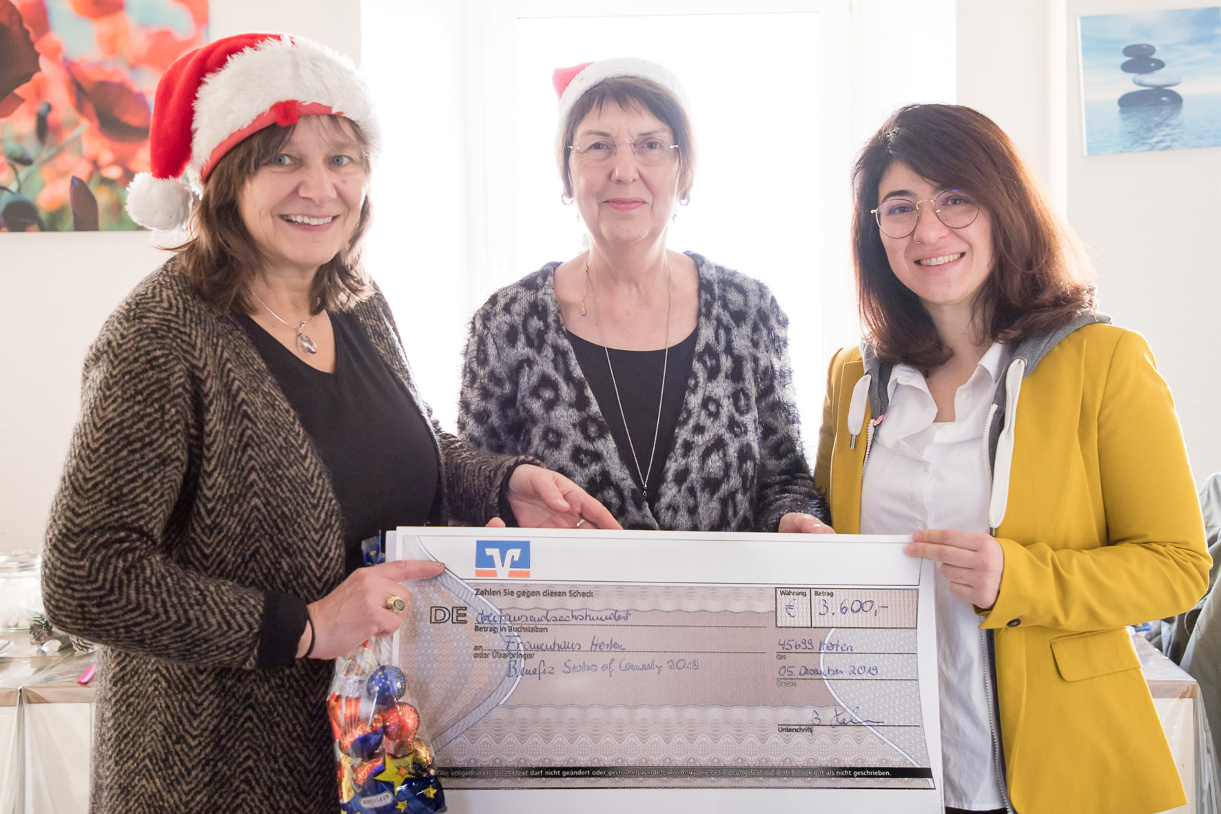 (v. l. n. r.:) Bettina Hahn vom Kulturbüro der Stadt Herten, Karin Hester vom Frauenhaus Herten und Aynur Terzi, Partin der Hertener Show "Sisters of Comedy 2019". Foto: © Maria Menze