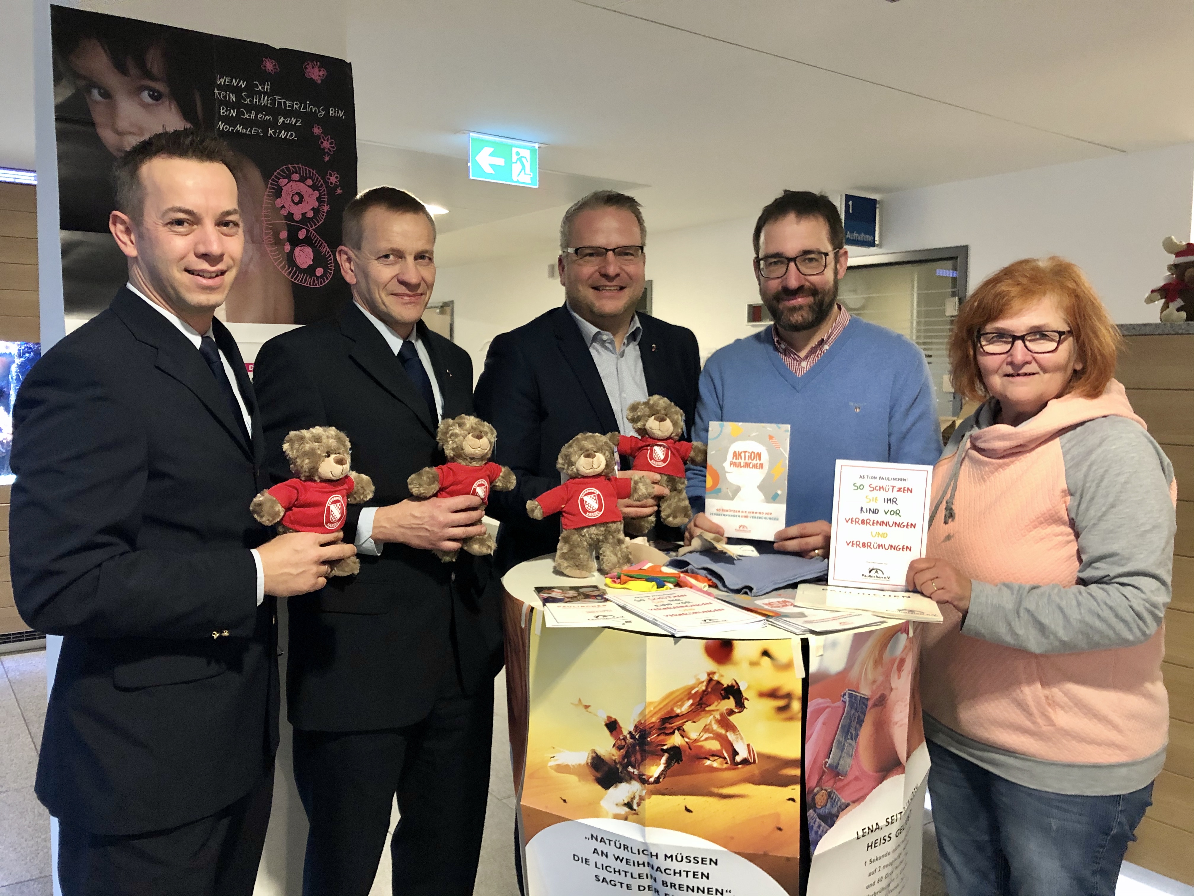 Tobias Winter (stellvertretender Leiter Feuerwehr Kassel, von links), Thomas Schmidt (Feuerwehr Kassel) und Brandschutzdezernent Dirk Stochla übergaben im Beisein von Dr. Andreas Strack (Zentrum für schwerbrandverletzte Kinder, Gesundheit Nordhessen Holding) eine Spende an Elfriede Filker (Verein Paulinchen – Initiative für brandverletzte Kinder).