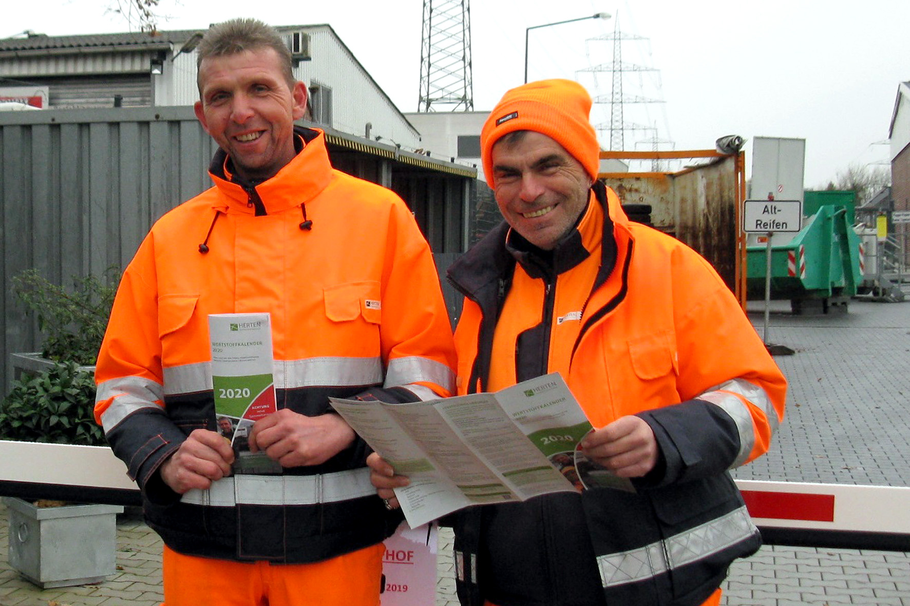 (v. l. n. r.:) Die Wertstoffhofmitarbeiter Thomas Magga und Uwe Tilg halten die ersten druckfrischen Exemplare des Wertstoffkalenders 2020 in den Händen.