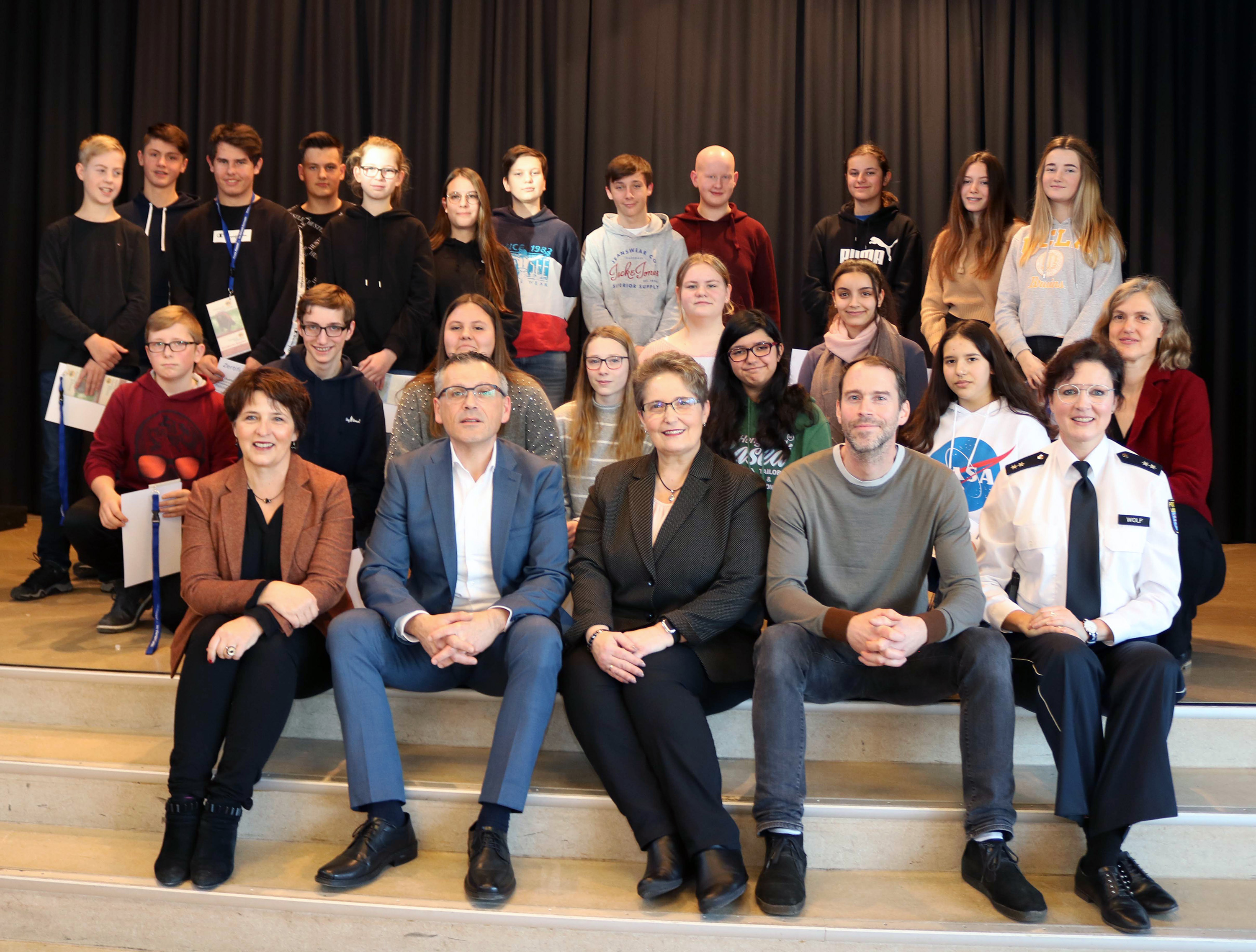 20 neue Fahrbegleiter machen den Schulweg von und zur Heinrich-Grupe-Schule in Grebenstein noch sicherer. Vorn im Bild: (v.l.) Schulleiterin Martine Boye-Griesel, Vizelandrat Andreas Siebert, Trainerin Birgit Schaumburg, Koordinator Sascha Lackner, Polizei-Jugendkoordinatorin Simone Wolf und Koordinatorin Hanne Schmidt.