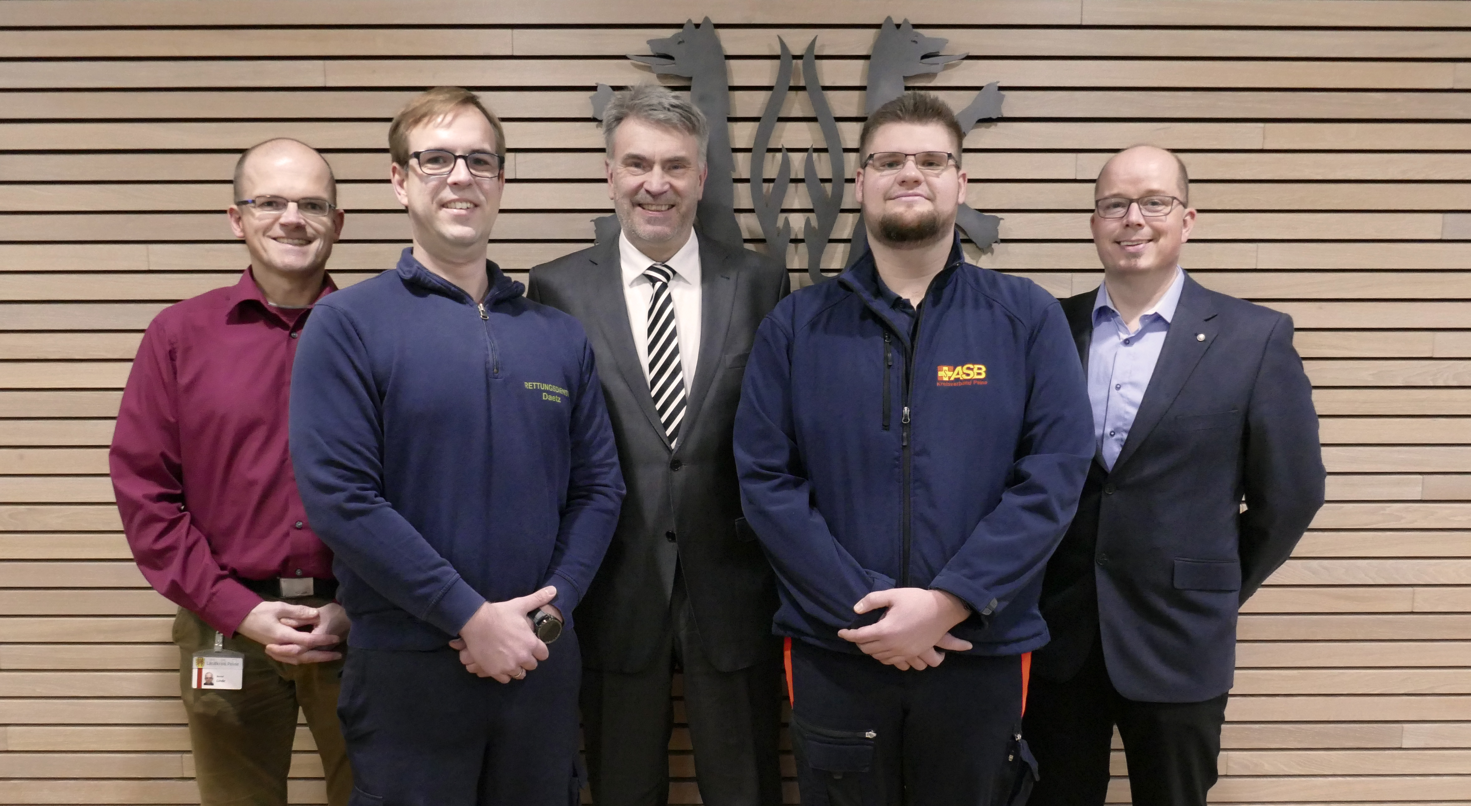 V.l.n.r.: Bernd Linde und Philipp Schrader (beide Organisatorische Leiter Rettungsdienst), Erster Kreisrat Henning Heiß, Maximilian Kairat (Organisatorischer Leiter Rettungsdienst) und Hendrik Voges (Ärztlicher Leiter Rettungsdienst)